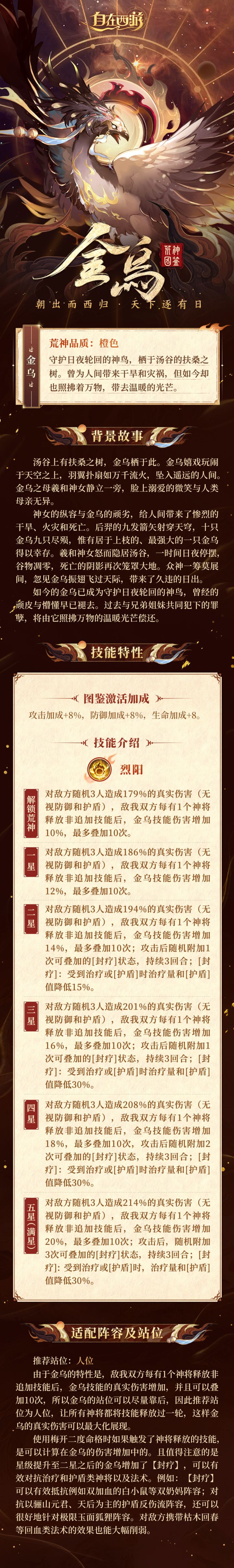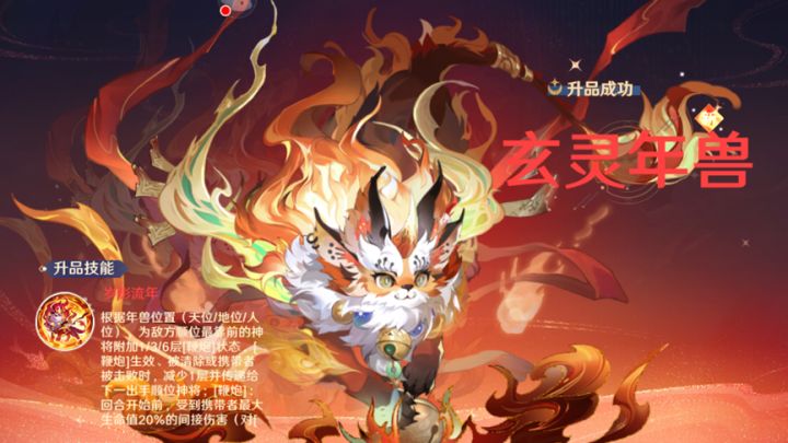 在世人的印象中,年兽似乎只有在年关时节才会出现。这是为了限制年兽过于强悍的力量,不得不以某种古老的法则束缚它。如今,远古荒灵唤醒了年兽血脉中沉睡的力量,往昔的诸多限制终将不复存在,它将重获自由,玄灵年兽降临三界!快跟着兔兔一起来看看这位升品后的荒神怎么运用吧!技能&解析解锁玄灵年兽后,可激活玄灵年兽技能——岁影流年。岁影流年:根据年兽位置(天位/地位/人位),为敌方顺位最靠前的神将附加1