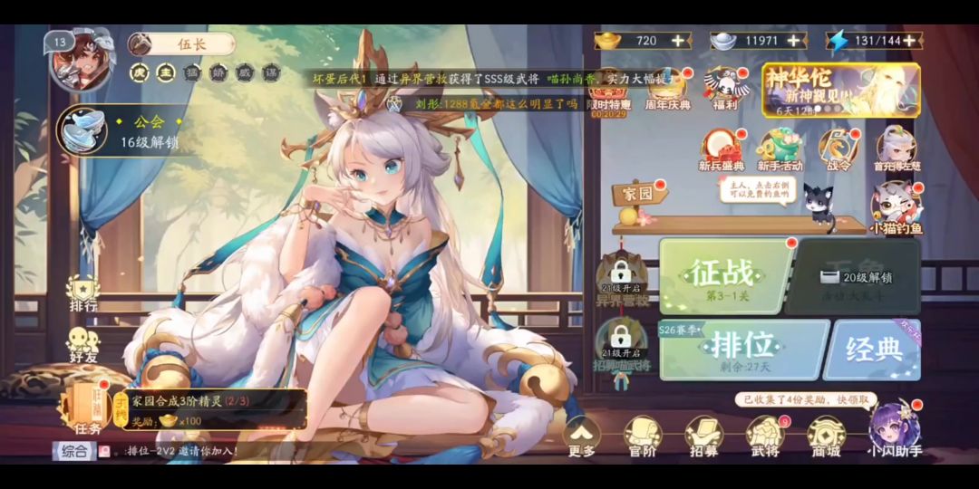 开月卡周卡,一天2200元宝,1000元宝钓一次鱼。100天不到就能嫖张嫙(200鱼),钓鱼武将全部靠月卡周卡嫖。 并且几乎所有氪金武将都会进钓鱼随机出,每个都是1%的爆率,很高了比起隔壁的0.004%,用双亲保证,我抽200发出了4个氪金武将(包含重复的转化成50鱼,重复的更划算) 神甘宁,神司马等老牌强神靠藏宝图嫖,这个稳定可以嫖到只是时间问题。 徐荣、曹婴、许攸等较强武将招募白嫖,这个