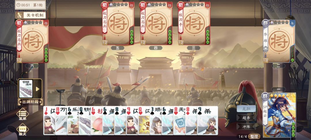 老版三国杀玩过。。。玩家也还是不少,也有两三年没玩了。。这款欢乐三国杀,我觉得,把有些过程做了简化。老版三国杀,是看不了谁是敌,谁是友的,只能通过玩家所选角色和出牌来判断。。。这款三国杀,都是“明牌”,这样估计受众范围更广,减少了每一局游戏的时间,也不用太烧脑。。。PS:可不可以把“杀”和“闪”牌面的小兵角色画得稍微“成熟”一点,目前的这个看着像是FLASH效果😂😂