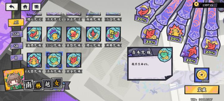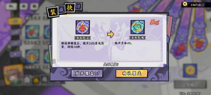 我也不太会讲述,直接明说如图我有五个紫色,用不重复的蓝色装藏,会随机一个地方,如果没随机到自己想替换的咒印,直接取消覆盖。以此类推,知道随机到自己想替换的那个,点击覆盖。然后用准备好的自己想使用的紫色咒印装藏,百分百替换蓝色。可以表述不清楚,大家凑活看看。