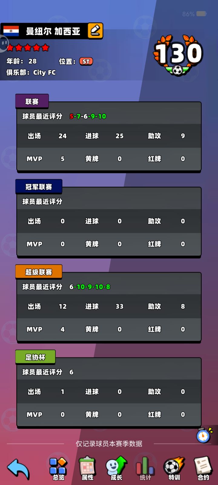 打造属于自己的超级新星,C罗,梅西,不靠抽卡。完全靠自己培养。游戏的自由度还是很高的。球员形象DIY球员的名字,造型,号码是完全自定义的。你可以打造自己喜欢的球员。让他们拥有个性的外形,是包装一个球星重要环节。游戏中可以获得脸型,发型,套装三种DIY道具,可以改造球员。让他们在球场上更有个性。自由发展的球员属性球员的属性是根据位置随机成长的,你自由培养,例如抢断型前锋,远射型前锋,速