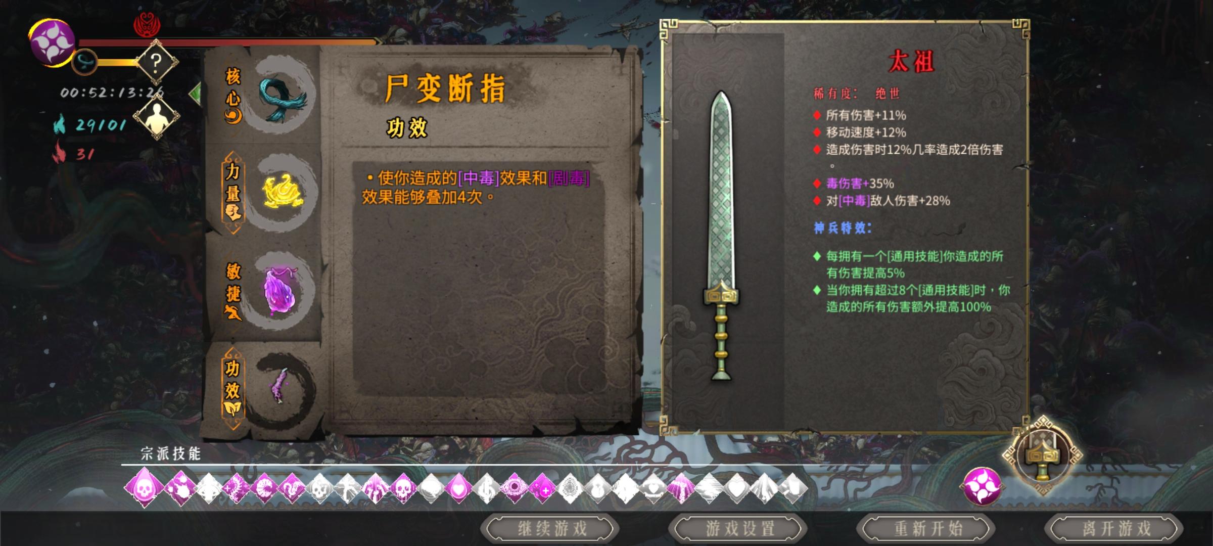 前期毒极度刮痧,无论一二。 过度期是真难。打了五局终于毒一过了。 分享一下,出门3堕龙(前两章全靠四圣剑),4断指。2青龙/玄武(一个能吸血,一个加防御,看自己操作习惯吧),1鬼妃(其实我感觉朱雀好像也行)。 我不太会毒,所以我就把毒一当飞剑来玩。 最后一局运气好,走火,魂多,还有武器太祖都拿到了。主要是秘籍数量够多。 终结一句话,雷一,冰二,酒神,无量,七剑都可以玩。毒?对不起,狗都不玩。