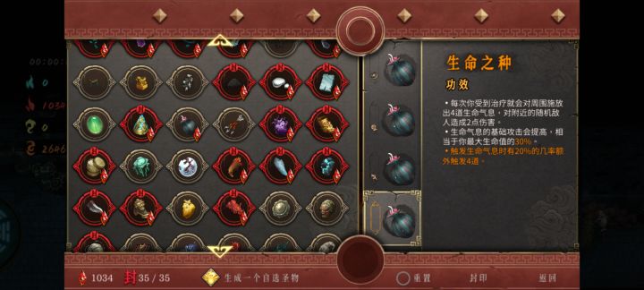 玩着玩着发现一个套路。开局就选个生命之种放4号位,挑战选个劝君莫停,攻击一下怪就可以一直触发回血,然后安稳度过前期。何罗神祇(远古宝库词条)又能让我们后期无敌。直接稳稳通关