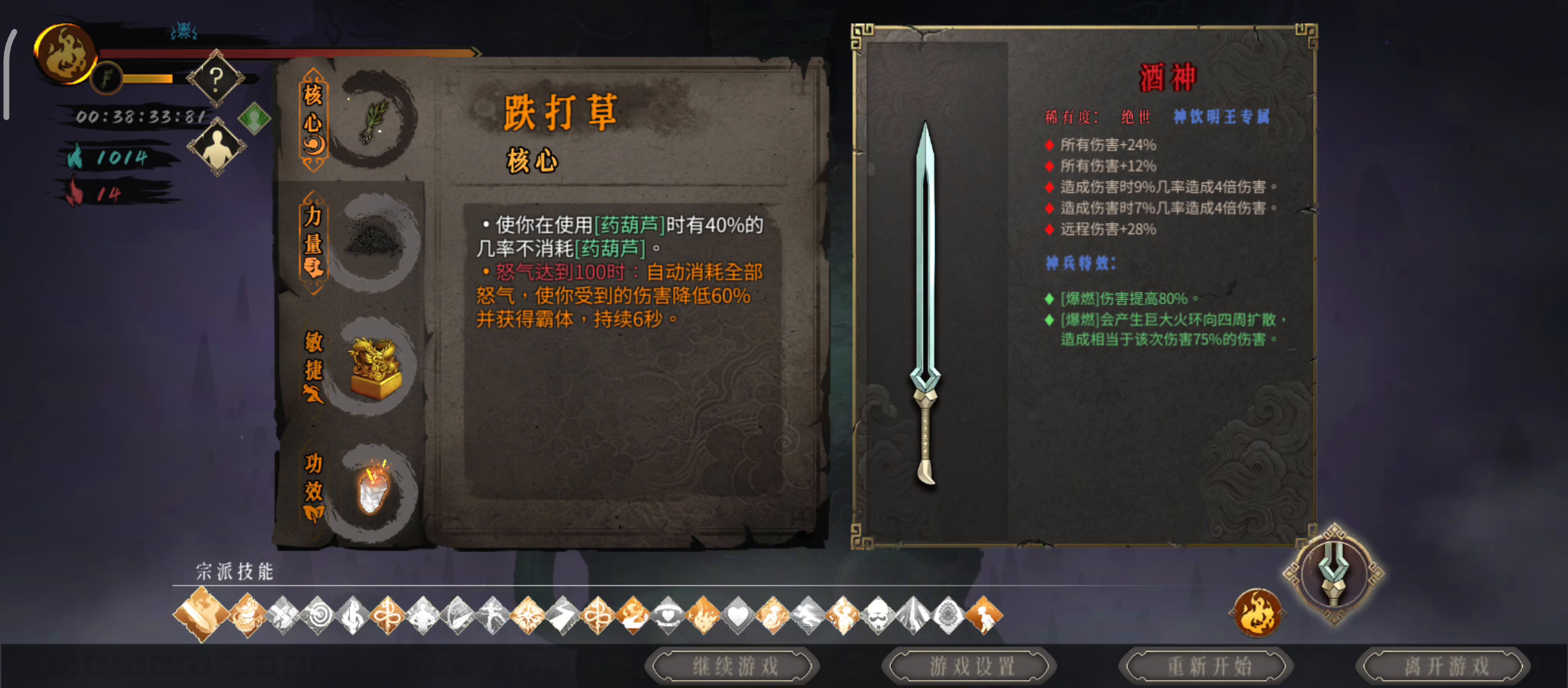 职业:怒目金刚1技能 武器:太祖最佳职业武器次之 精髓:核心1灵芝 2玄武 3踏风草(雷1必备)4猪
