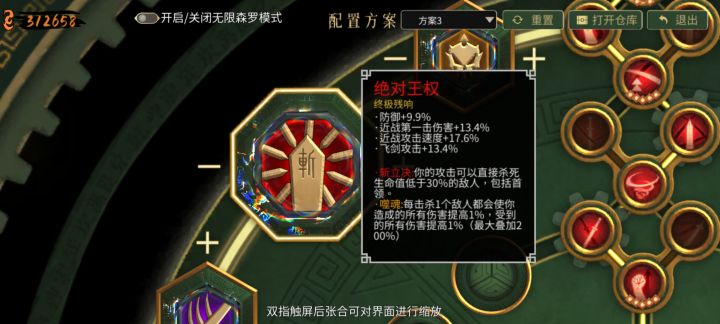 换了数不清的套路打法,死了无数次!! 我连武器都没洗,魂少的新手可以到最后洗! 自带:攻速+全伤害+冷却缩短 都能增加伤害! 圣物选择 出门自选:3号位《机关喷口》其他的看运气 可以搭配4号位《墨火结晶》和1号位《朱雀》 开局拿5红魂换蓝魂给最多的!! 前期两关靠着【瞬位】清怪,boss靠【神行一闪】 武器选择 前期随意带,免费换武器可以换一下!!(白嫖香) 最终武器优先【太祖】其次可以随意搭配条目好的! 【屠龙刀】可以带橙色的有概率3倍伤害!! 红色不建议因为打boss靠秒杀,红色降低百分之70就已经拉低伤害了!! 并且少一条(条目)影响不大! 核心技能 【走火入魔】【斩龙诀】【魂多势众】【不二打】 其次技能 因为可以吃到:近战+飞剑+攻速+冷却 这些伤害! 优选选择数值高的技能!! 我前两章用时22分钟! 后面10分钟左右通关!!! 喷口和凤凰+墨火我是在第四章【大将军】前才在老板娘那里更换的!
