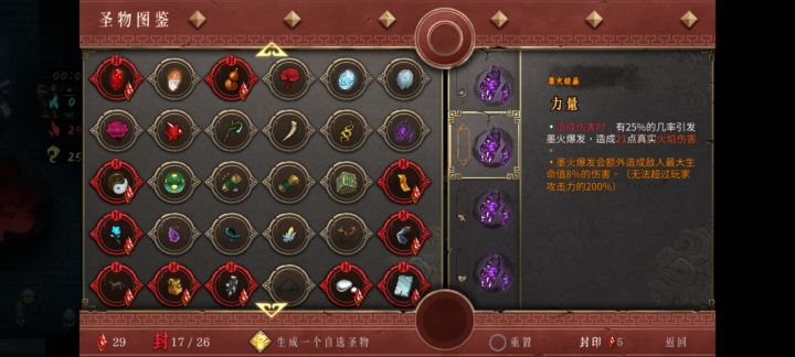 人物:酒2 武器:太祖(前期可用任意+火伤的武器过度) 初始刷出:黑火药(2号位 )或墨火结晶(4号位)刷出其中之一另一个在圣物图鉴里选择 注意:出门可以选圣物需要把天赋里的记忆赎还-炼中的圣物拟态点出来才可以 特别篇:这套阵容进图后需要选择(燃爆)和(蛇酒)记住不是龙酒 不是说龙酒不好只是个人建议 前期收剑速度不是很理想需要看好时间,防止暴毙