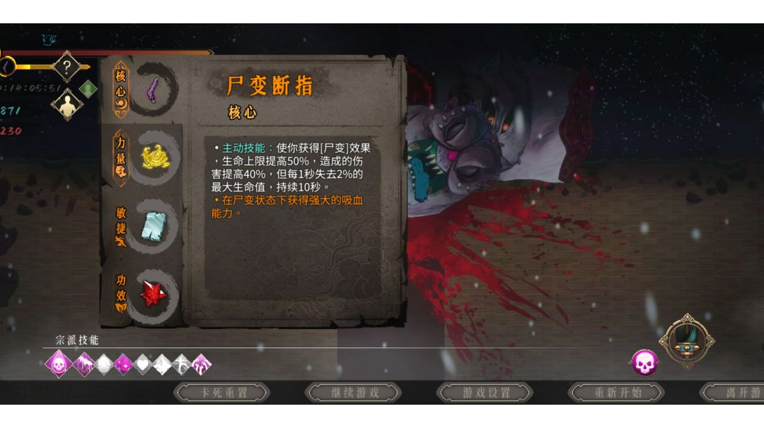 不要点万毒尸身,不要点万毒尸身,不要点万毒尸身。 影响体验感,近战流派通用,前期尸变断指放核心,狂暴之血放功效,青钢紫色就行,没玄武就用血灵芝替代。该玩法的核心在于开启尸变断指有无敌帧并且在接下来几秒内会有几率闪避攻击(应该是bug)而且血量增加50%还会获得40%的伤害加成,断指的扣血可以触发狂暴之心的被动,四秒就能用一次。(因为后面点了万毒尸身,所以就不拿出来了,就拿猪章演示一下)