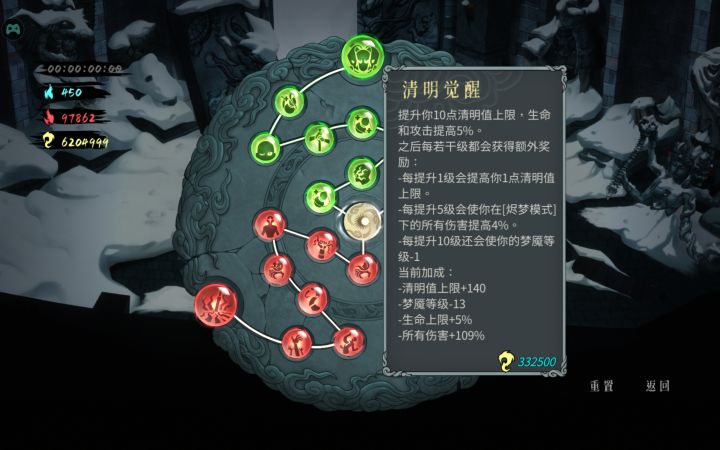 开局拿到一个猪心,自选了凝气草分别在一号四号位。 后面选了两个加成蓝魂获得挑战。 这把成型很早,序章过去之后我就已经是一号位猪心,二号位猛虎,四号位凝气草+一把绝世咒杀了。三号位我都是随便配的,刚开始是踏风草,选了不动如山之后就替换了朱雀,加成一下移速。 后面基本上小怪挨不了两下平a。 打BOSS全程流畅,技能就选加成攻击,路上所有的精炼也是加成攻击。