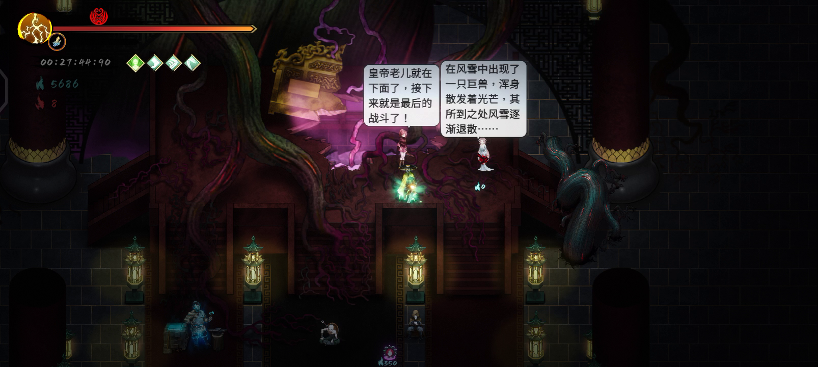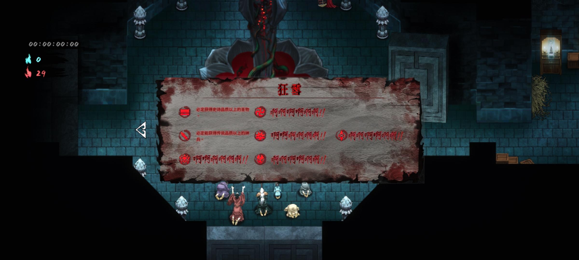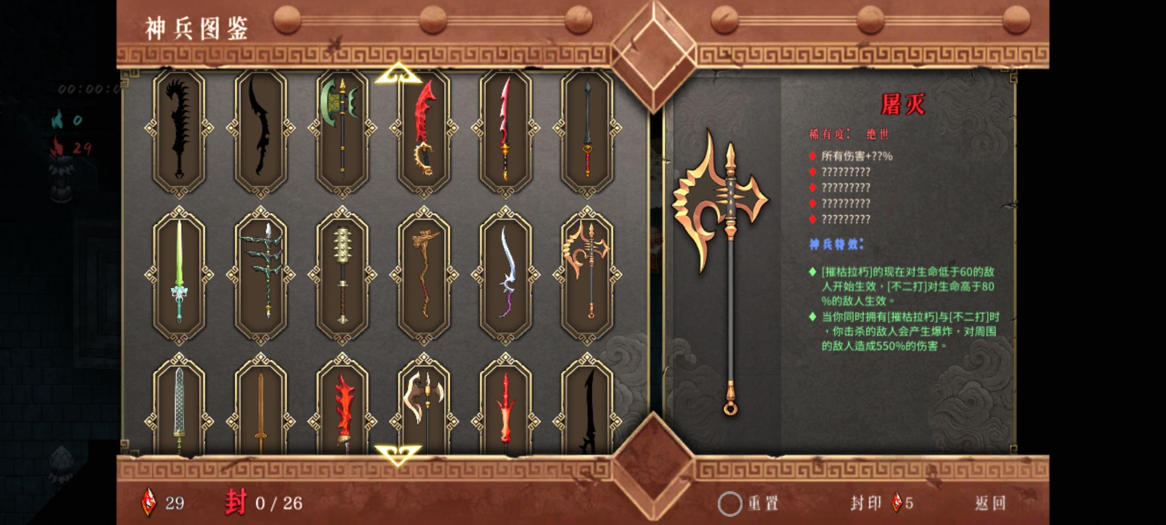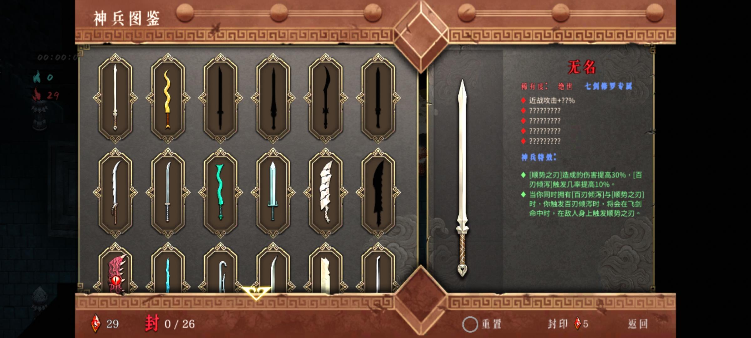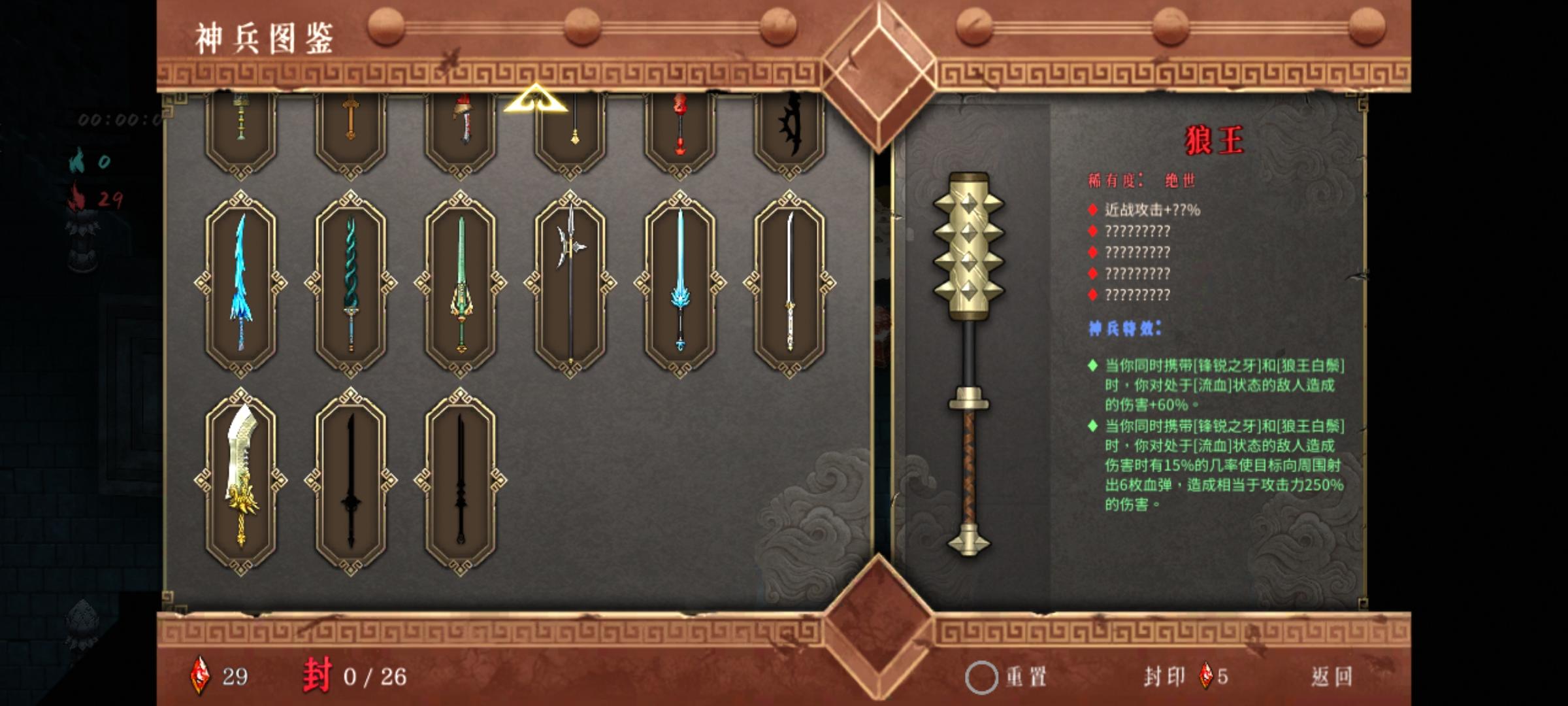 神行2出门3号位机关喷空,4号位猪心。然后一号位尽快拿到须臾,2号位玄武,没拿到玄武用朱雀。密卷出门尽量拿,不二打或走火入魔,然后凑齐加攻速和瞬身有伤害的那个,当然后面点自身的一刹永恒那些的也要拿然后序章进门红魂挑战选择,怪物移速增加,怪物获得吸血武器太祖,词条第一个只能全伤害,剩下词条尽量全拿接近,40收剑和40近战攻速都行。感觉伤害不够可以拿10概率4倍伤sl当赌狗打boss现在就是