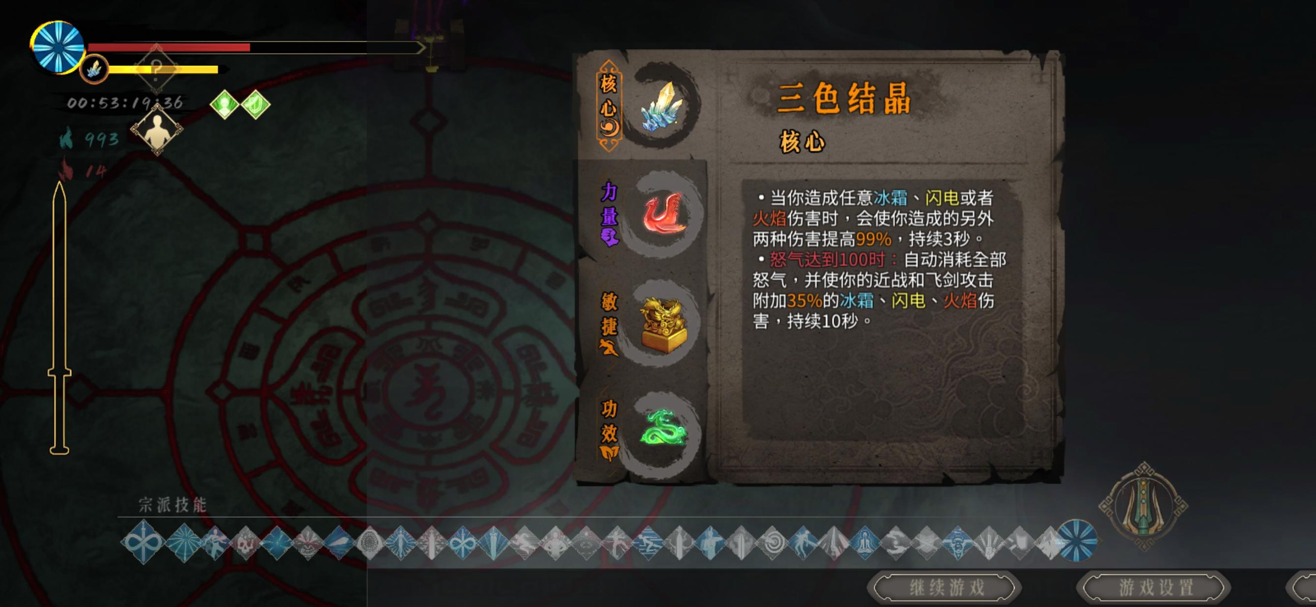 刚才试了一把元素流剑神,1号位三色,武器红色三元,居然也能过……刮痧是挺刮痧的,拼命堆攻击也只有200多,伤害数字都不大,但是密密麻麻全是数字。摁住远程攻击不放手,剑热满了就收剑,继续刮。意料之外的一点是这流派居然挺硬的。那个门派技能的霸体加防真好用,拿了走火入魔,boss二阶段一刀重劈也只能打我1/4血。