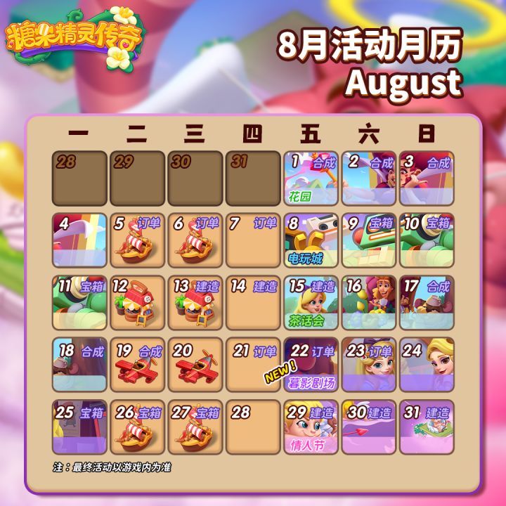 各位小精灵好呀!8月份活动日历🗓来啦!下面为大家敲重点!!!!✨【副本活动】8月一共有5个历史副本返场!之前没有集齐图鉴的,这次可以加油咯🎇!第五周恰逢七夕,为大家安排了甜蜜💕【情人节】副本!✨【积分活动】每周二至周三的轮换积分活动:🚢皇家船运、🍖布鲁尼小吃店、🛥飞艇旅行记,见图标标注。✨【竞赛活动】每四天轮换的竞赛活动(合成、订单、宝箱、建造)排期,见文字标注哦~🎉如遇到bug