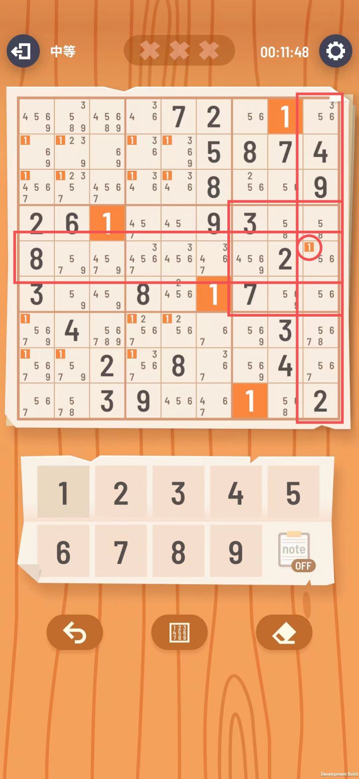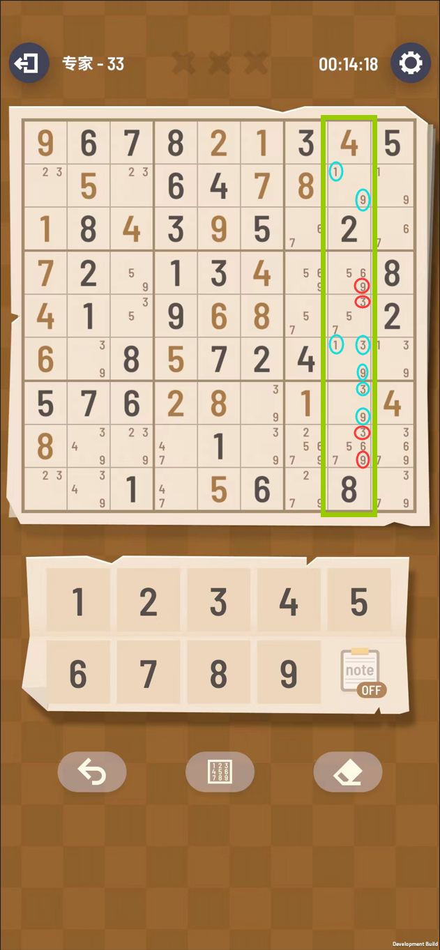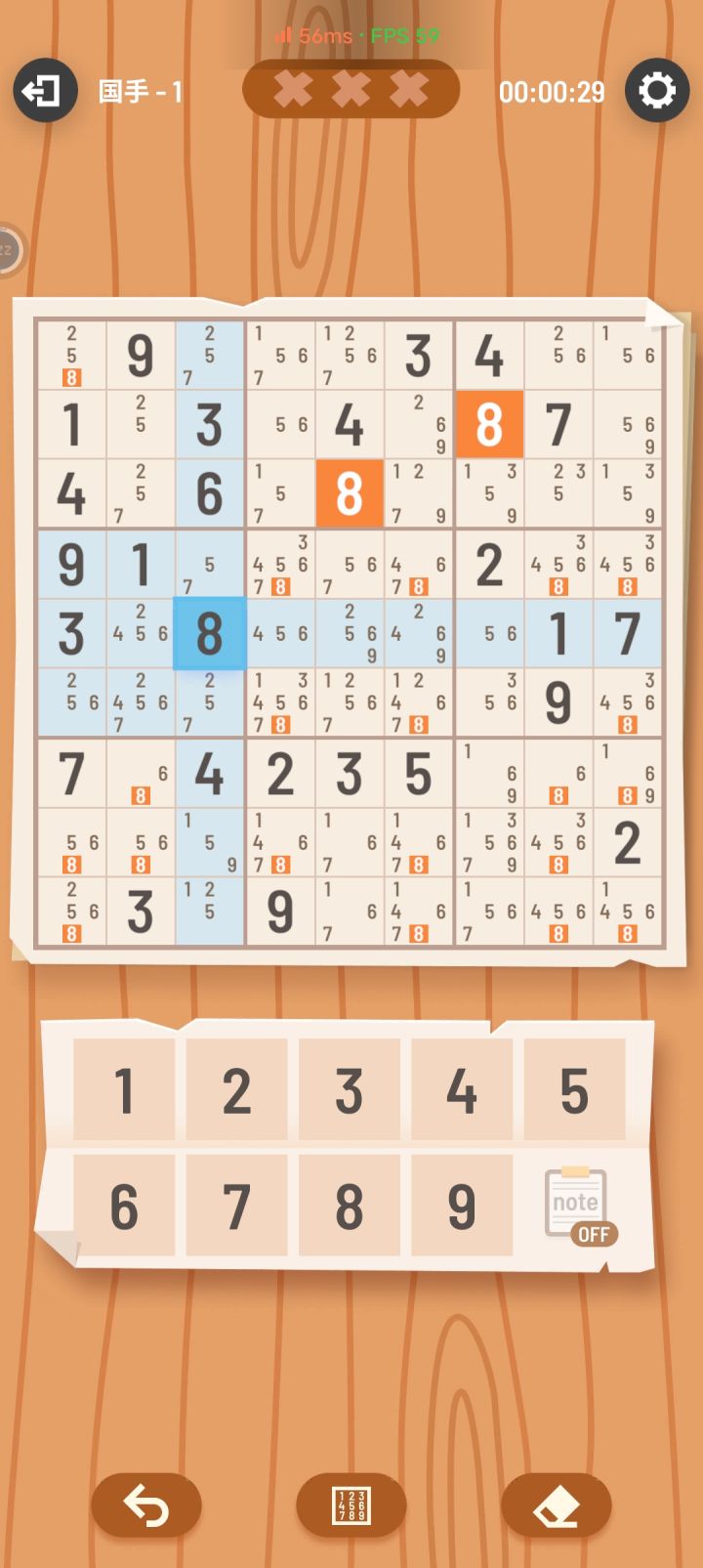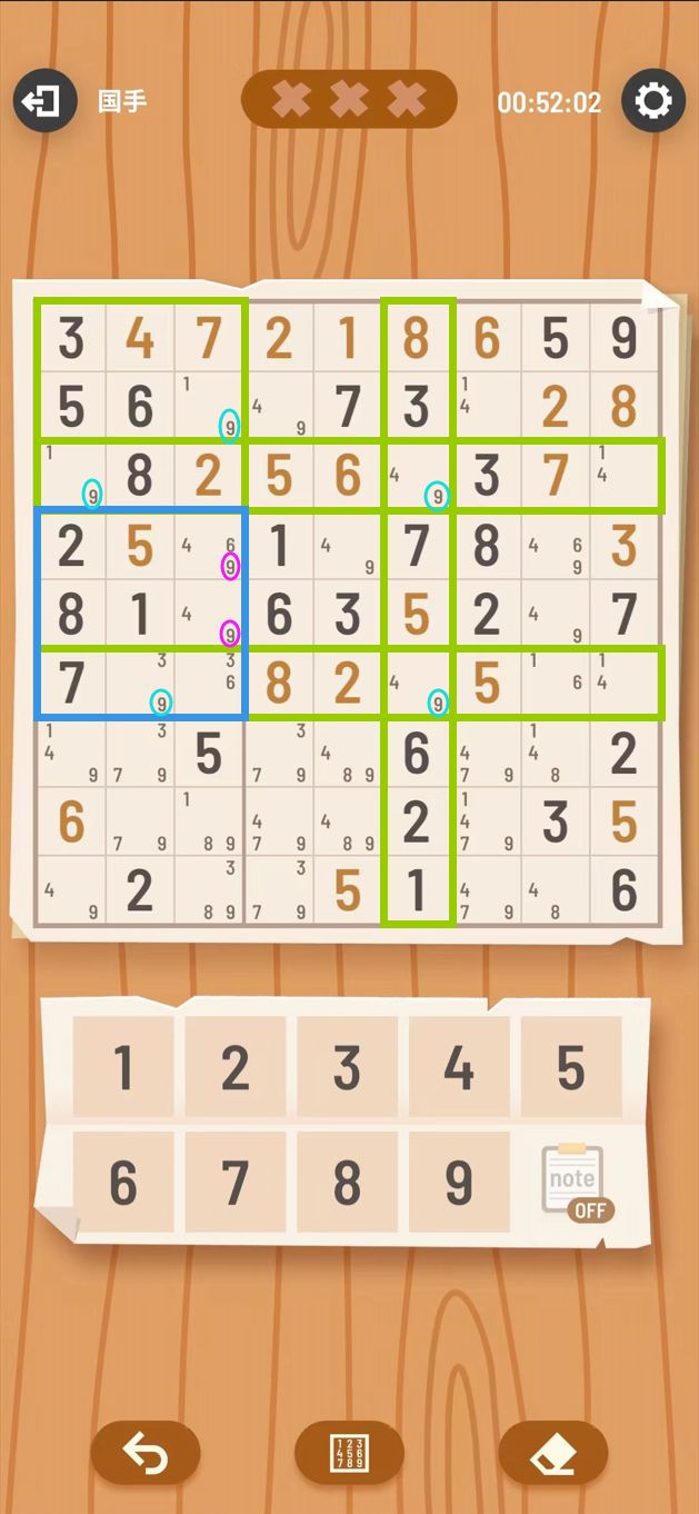 以国手第一关为例,我们先点击题内1~9的数字。如下图我们可以看到点击黑色的数字8后,所有的格子内存在的数字8可选项都显示出来了。其中左上存在唯一可选项数字8,那么就往这个格子填上数字8。以此类推,找到存在的所有隐藏条件。填找出来后,我们可以看到现在的情况。那么难题就来了,很多未知的条件太多,我们怎么进行下一步的解题呢?我们姑且分为几种方法:一是找已知条件最多的九宫格或者是竖排的九个格子。二是