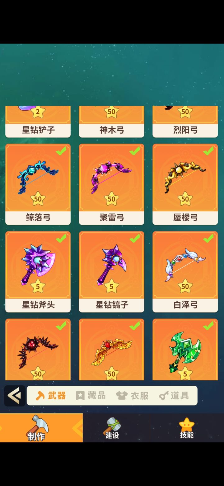 蓝紫橙武器满级分别为30/40/50。 蓝紫弓升级材料均是本岛打怪,挖矿,钻石。一个传说满级需要149个精炼石,橙色工具需要四十个,不过建议后期毕业了再升。 白银,黄金工具图纸找一岛那个老头,成就奖杯领取,这几个工具可以考虑升一下级。一把传说弓满级,增加面板攻击15001-10 9个1级精炼,900钻石11-20 20个2级精炼,2000钻石加200钻石21-30 30个3级精炼,30