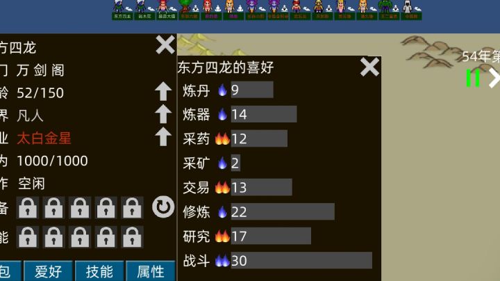 我的心得就是开局一个最高的战斗类职业就行(你们可以把他当主角玩),其它两个炼丹高点就行,然后把其它宗门数量调0,一定要点生成ai,会在地图随机出现一座城,然后就可以无限生成弟子,先找到它然后把宗门放旁边就行。 除了(主角),任务分配的话我一般是战斗全调0,炼丹三,其它全是一,然后炼的丹全给(主角),(主角)的任务分配就是修炼三,领悟三,战斗三,其它全0,然后装备好一点的全给主角就行 我也是萌新哈才玩两天,有什么不足的请教大家