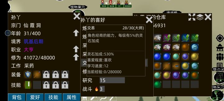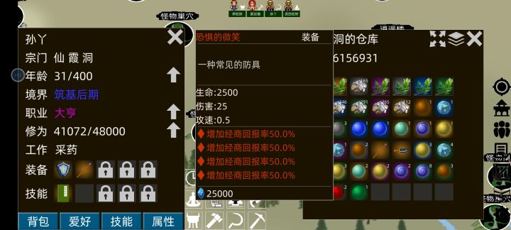 开局选个大亨或者沈万三,要交易高的,给点零食让他交易,买回来卖回去,我方零食会一直增长,被交易方零食不变(应该是bug),可以一直增加。先去仙人买功法,缺丹药装备买别人的就行。还有那个职业升级,大亨升沈万三,玩了19年一点没动(这是bug吧?)
