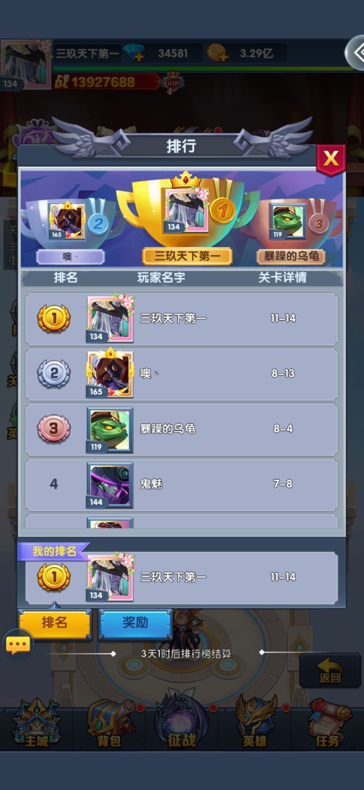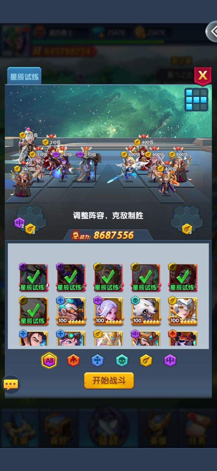 一,阵容及优先升级顺序就合并了:奥利给…弗格斯…末日…夏…艾丽西亚…雷神<图一>原因:星辰试炼只计算等级和技能,不含天赋和装备加强,所有的英雄开了图鉴就能上二,开局就T字占位,猛怼,打不过就堵弗格斯的控制反复打,大约能超越20%战斗力过图。过图优先 过图优先 过图优先,别纠结完美,活动天数差不多够你领完奖励,不够的去前面的补一两个图到三星完美<图2>,更高的图能够更快的获得升级资源三,冲
