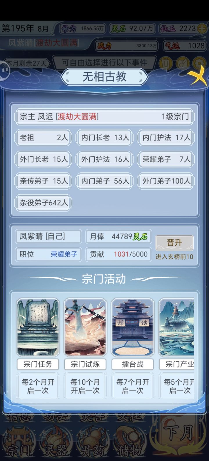 那么开局开始,无脑冲修为,有宗门贡献任务就做(做到内门能点藏宝阁两次就行),藏宝阁出了必点!(前期不用管战力一路升修为升上去就行!)