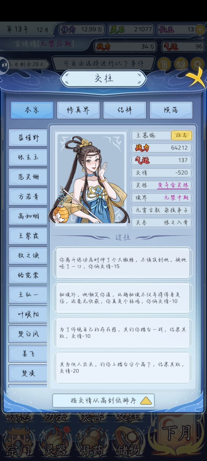 合理吗我想问,我变异天灵根接单中期6w,这上品木灵根筑基初期8w????我就想说咱一个单机游戏能不能把这个战力优化优化把他变得合理一点,让玩家体会体会龙傲天的感觉呗,roll的半小时变异天灵根加上一堆红色词条,进游戏大家全是变异灵根,我搁那广告一个不拉,npc战力还比我高的多,我真的觉得离谱
