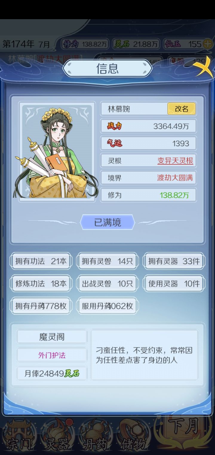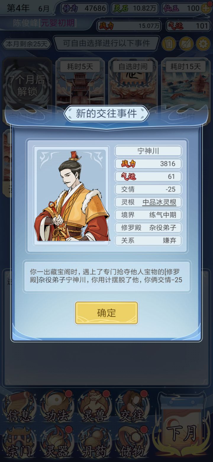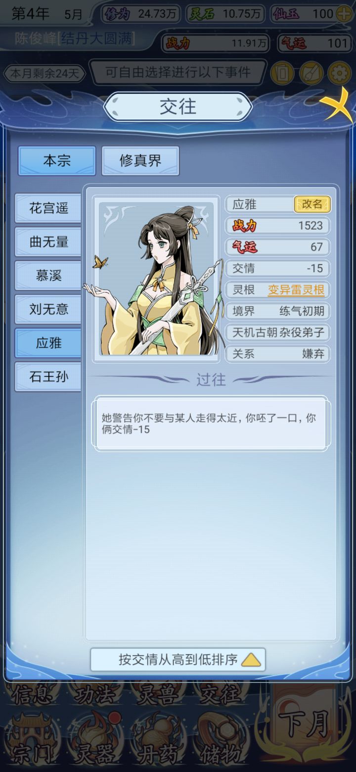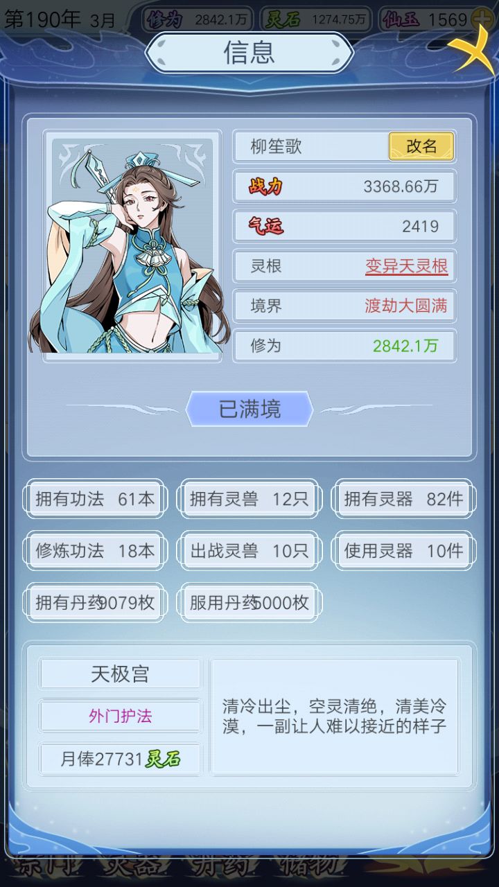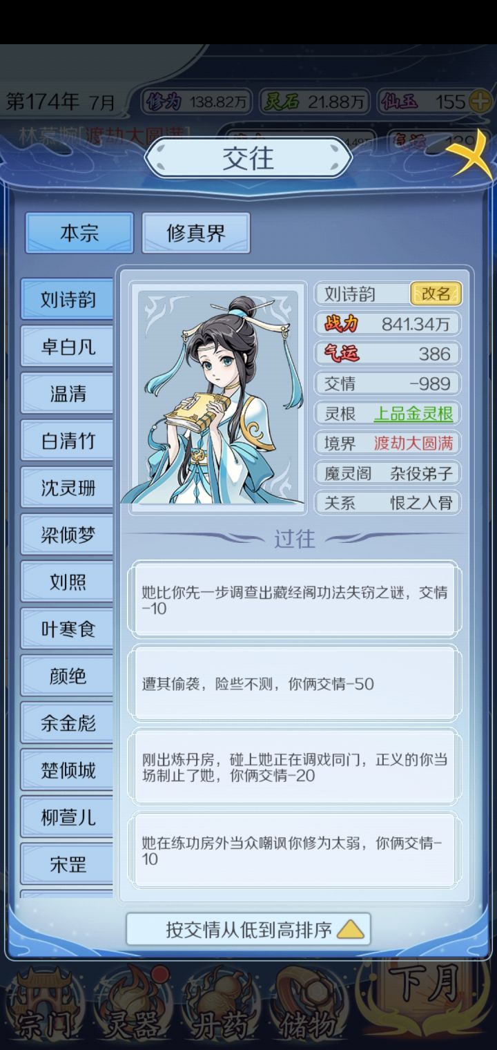 这游戏怎么说呢,功法帝级极品没多少,到最后只能拿帝级上品来替代,武器也差不多基本上到后面都是重复的,然后想吐槽的是这个交往系统,到了恨之入骨的境界 竟然没法击杀,看了他的名字出来 气的牙痒痒,还有这个宗门,贡献点太难涨了,然后炼药都会出一些没什么卵用的还魂丹之类的治伤的东西,😡😡😡😡😡