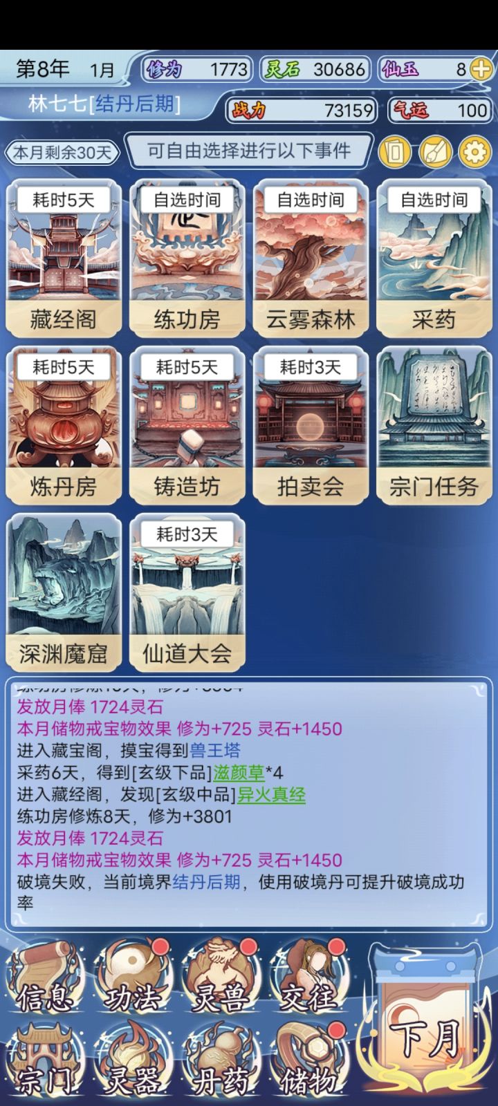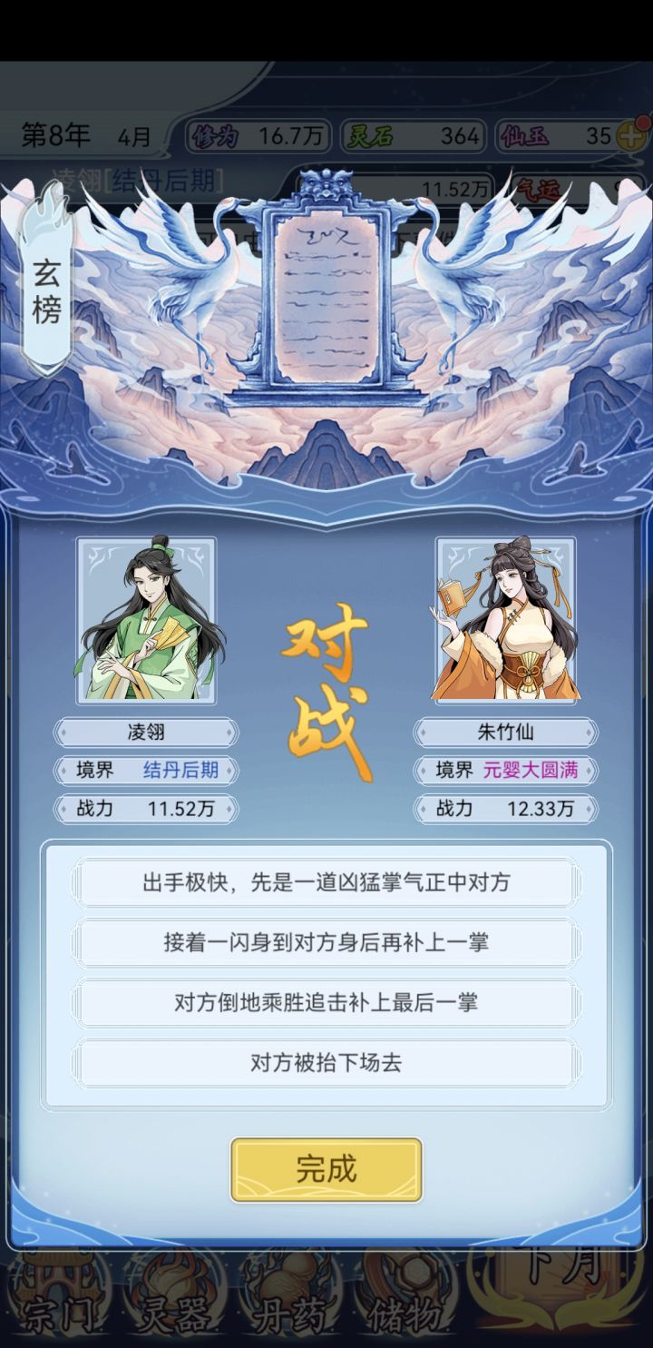 。。。。玩了一个小时吧,总的来说,不好玩,十二年我长金丹大圆满,一直就点采药,然后练丹,玄榜也只能打到74,战力也不好升,玩得很难受