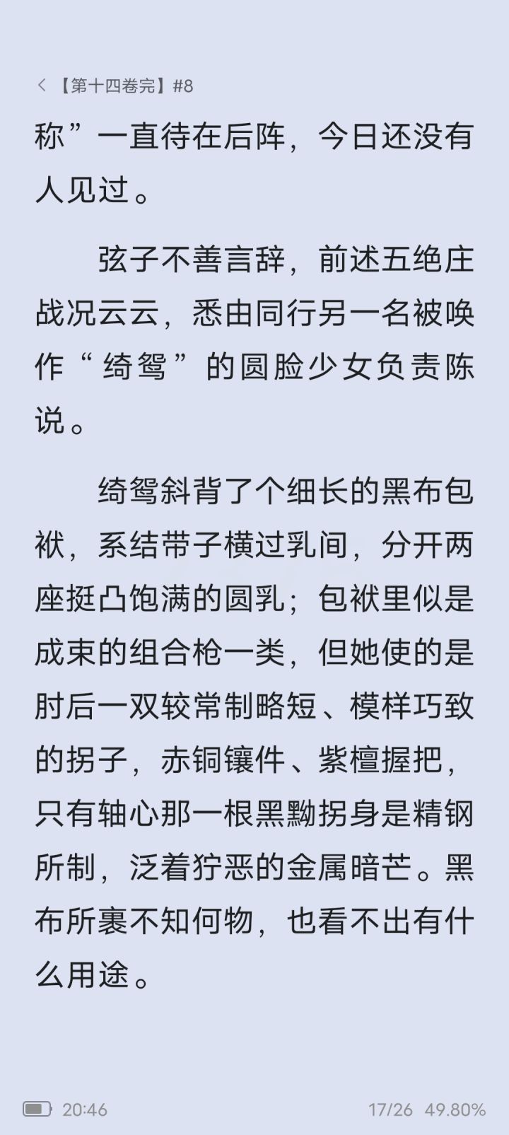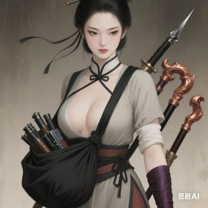 绮鸳斜背了个细长的黑布包袱,系结带子横过乳间,分开两座挺凸饱满的圆-;包袱里似是成束的组合枪一类,但她使的是肘后一双较常制略短、模样巧致的拐子,赤铜镶件、紫檀握把,只有轴心那一根黑黝拐身是精钢所制,泛着狞恶的金属暗芒。黑布所裹不知何物,也看不出有什么用途。