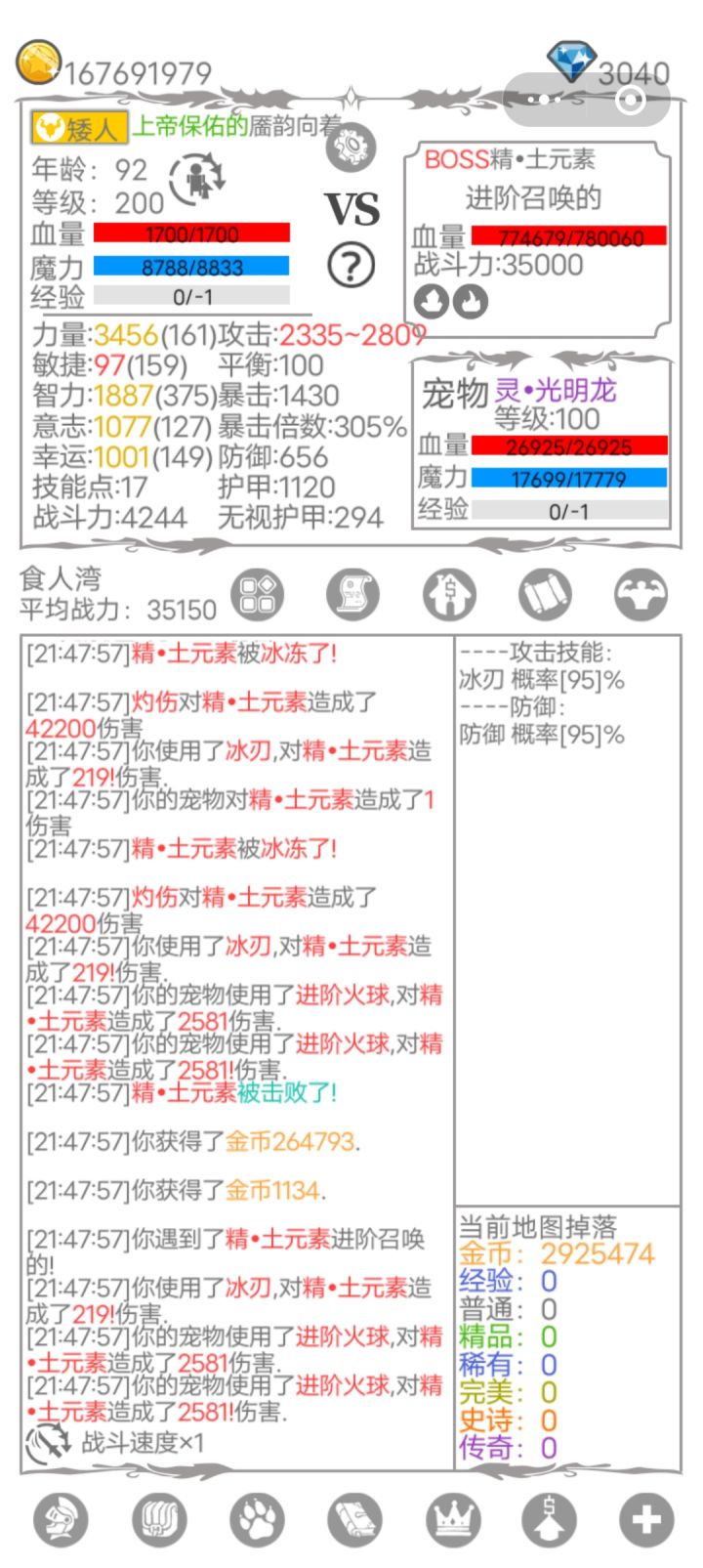 应该算是低配,主要就强化了两个饰品,力量,魔力为主,破甲为辅。第一次刷出1500万血的boss,给boss挂上进阶雷击buff,第二次把boss血量磨到800万附近,第三次换上回蓝耐草宠一波打死,也就是本视频。本来400魔力应该够了,结果不小心把另一个力量饰品给爆掉了,本来有2000力量的,结果默认强化没勾上保护符,悲剧了。另外需要注意的是暴击好像跟破甲有关,破甲太低的话暴击堆高了还是不容易出暴击,所以破甲100多还是必要的,而且打小怪也能快点。一周目通关大概花了6天时间,一开始没刷保护符,如果熟悉流程的话大概2、3天就能做到,主要还是保护符比较缺,只能看广告获得,这点比较恶心。