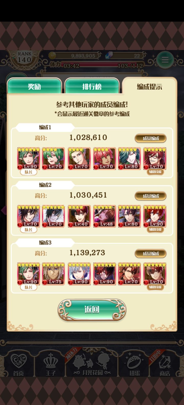 参照游戏里别人的成员编成,做的,辅助王子我选全员攻击力最高的,但是满三星要看运气,要多刷几次有时候红色球球出现的少分就地低。游戏里的编成,第一排红队基本是平民队,有两个是活动的,但是只要肝就得了王子参照别人自己组成的红队。#我的独立游戏日记