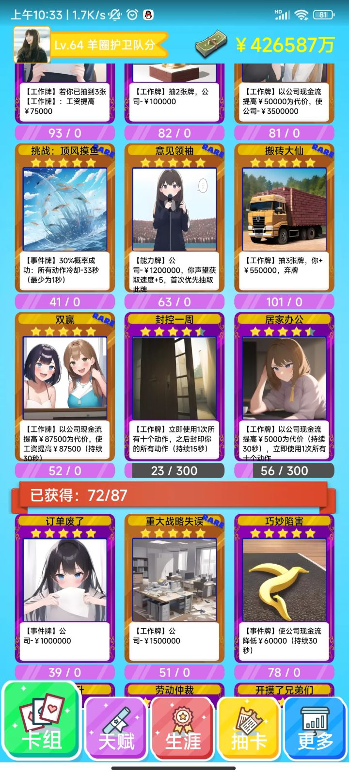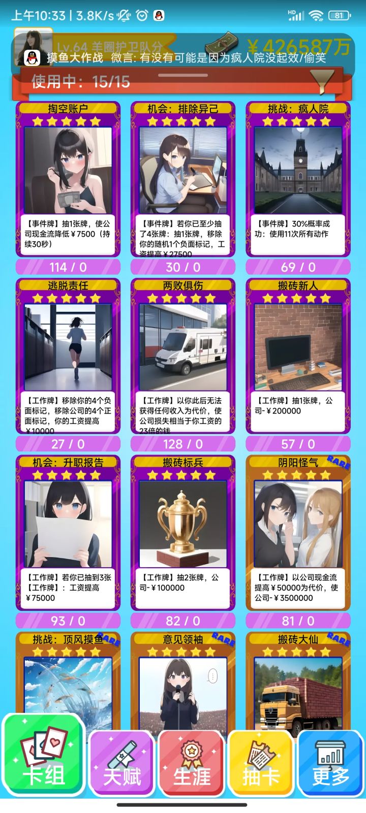 说下个人用还不错的流派0、游戏15个卡位内,4无条件过牌1清状态是锁死的。等于说只有10卡位。1、鱼套。核心就是三张摸鱼倍率卡,等第二个兼职触发摸鱼。可以考虑带主管凑30零食增加斩杀线。这套只吃天赋等级不吃卡等级。缺点是吃不得干扰,三个动作禁一个完不成斩杀。2、工作套。别问,问就是凑10工作,疯人顶风秒了。疯人斩杀线太高所以带领袖不带优秀员工套,争取把疯人抽出来就行了。缺点是斩杀不稳定,工作牌本身拉得一比,抽到非过牌工作牌就是废卡。3、事件直伤。风险套加强后能玩时间变早,配合直伤卡和百分比卡直接强杀。自带禁制度还不怕禁抽卡外干扰。缺点是风险套6级以下不能玩,直伤卡数值成长不合理,要10级甚至9级才有效果。