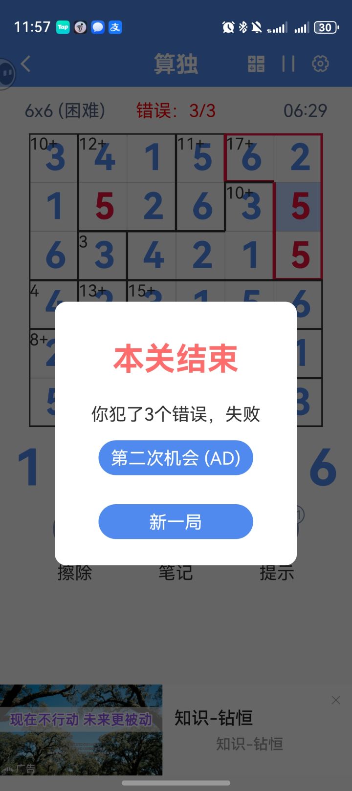 本来只有一次错误,最后一格4手抖连点了两次5就结束了,气笑了#