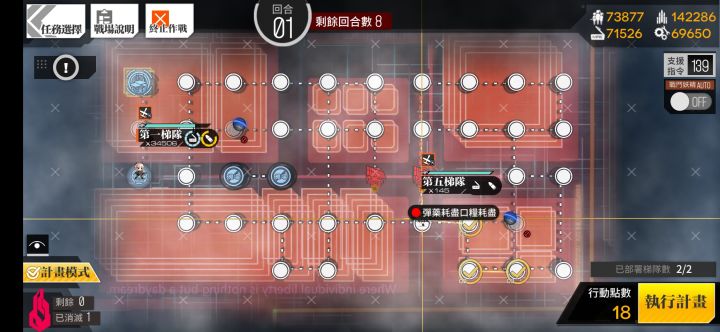 帶空降妖精(有視野才能使用技能)三回合能結束(看臉)四回合的話能打三次Boss攜帶人質的梯隊還在其它梯隊就算撤退也能獲得S評價(這是為什麼↑)資源儲量慘不忍睹……下方截圖中計畫模式最後一步是直接空降的…衹能説這樣最省事……第二回合喊"狗糧"(手動補給)主力在位置"03"(第二回合結束)可能被兩個紅雷圍著…幸虧手槍隊低耗…結束回合 臉不好衹能撤退…第一回合救人質喊