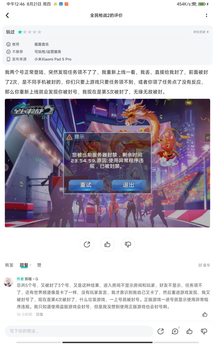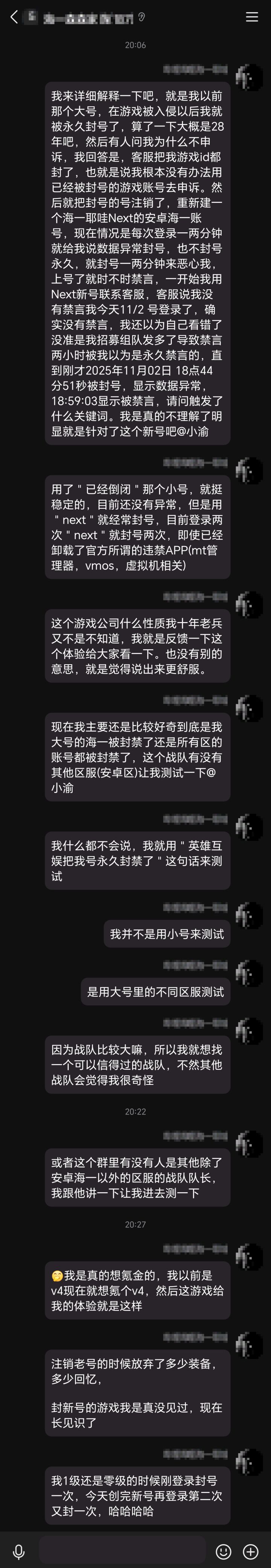 我以前的全民枪战大号因游戏入侵被永久封号,客服还封了游戏ID,无法申诉,我便注销并新建安卓海一账号。可新号总因数据异常短封、禁言,用含“next”的号就总封号,换“已经倒闭”的小号却稳定。我就想测试下是仅海一区账号被封,还是所有区都这样,想找其他安卓区战队试试。这游戏让我挺无奈,新号总被封,我还想氪金都没机会,注销老号也舍弃了很多装备和回忆,真没见过这么折腾新号的游戏。