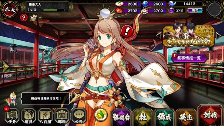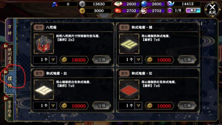 华为机闪退 只能用卡卡的模拟器来水帖了搞些基础的试试先做一个是一个八寻殿 类似于小屋的地方(就是小屋)可以在八百屋的摆饰中购买装扮购买需要消耗战货 战货可以在讨伐的每日副本中得到 请点击摆饰一览来放置购买后的摆饰