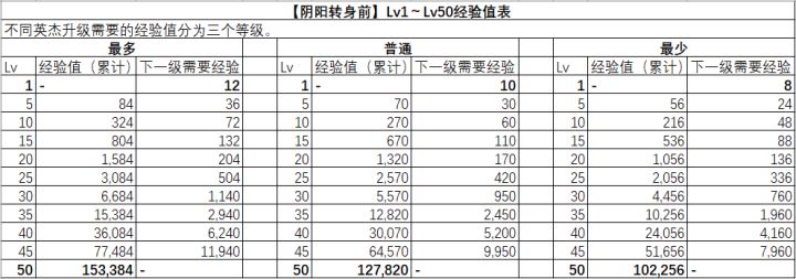 很开心还有一个小时国服就正式启动啦虽然有种预感会提前偷跑【小声bb】感觉在开服第一天应该发点攻略庆祝的说,但无奈一天的课…所以决定拿之前的存货水个贴【bushi所有英杰升级所需成本分为这三个等级,可以通过一级需要的经验值来判断将该英杰阴阳转身的成本。这三个经验等级在转身后50-99乃至99-120级时,升级所需要的经验会再次分层为三个不同的等级,所以等一哈我再放出来后续的表格∠( ᐛ 」∠)_