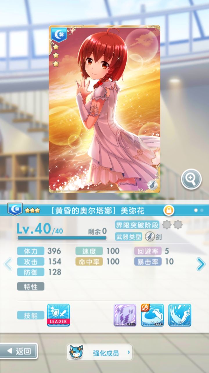 今天终于凑了三十丝,给她突破了一点可以看到她的三星+1初始攻高达202,防御和体力尚可,速度一般(甚至偏低),四星+2应该极强(详情可折跃其他dalao已经有的天衣帖子)由于技能满的,她现阶段都能做主力