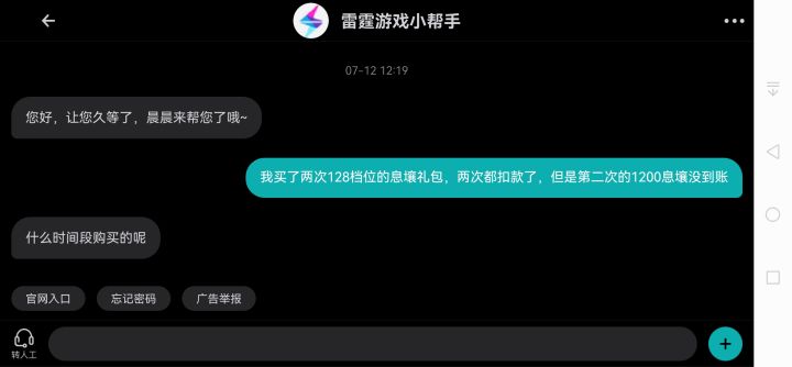 问题反馈从中午12点到凌晨12点了。钱扣了但是不给我息壤,甚至游戏活动里累计充值金额都加了128。中午反馈一次,客服说让我等后台消息,并且会在客服页面告诉我。直到下午我去主动问,客服居然说已经解决了?然后既没有客服页面的通知,也没有邮件给我重发。我提供证据后客服继续让我等后台消息,并且说那时有人上班呢。结果现在都凌晨1点了,依然没有任何消息,逗我玩呢?你们是这么上班的吗?就算我128真打水漂了,你