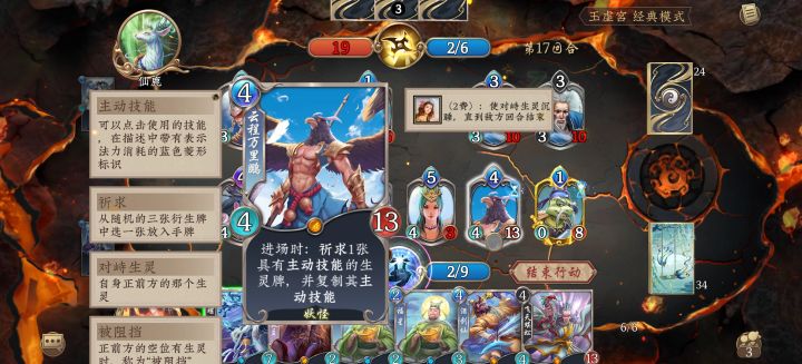 玉虚宫仙鹿技能是进场效果触发两次。大鹏鸟在已触发两次祈求的情况下,只能使用第一个主动技能(女金仙),第二个主动技无法使用(图中的飞天蜈蚣)
