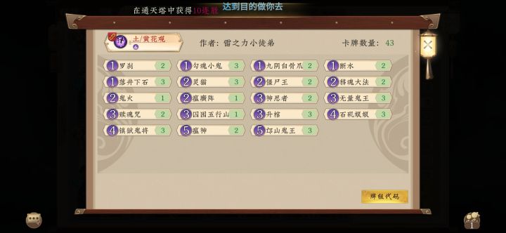禁水,另外找了套萌新能用的。代码:H4sIAKomXWkA/5NrZLNxvrng6oJOhT4HL0V2xxsJ1xZ0J1xVCErsP9Ag49ik3hTFDAD8gMDHJQAAAA==思路:起手留铸剑和燃木或三转,让对面铺怪压血,方便后面用掌心雷。金山寺撑过四怪变六怪。燃木或三转清场后,铸剑控住8费。之后不要修炼,吃天地同寿亏牌。用直伤突脸。打完牌库直伤后,用无定法门拿对面的颠