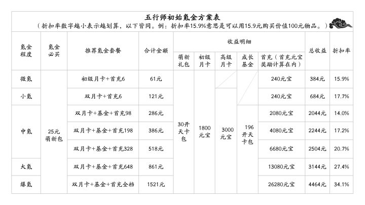 其实很久以前婆婆就做过这方面的梳理,虽然时间久了些,但氪金方面的事情并没有太大变化。我还是先放一下简易版的结论和婆婆当时做出来的氪金推荐档位图(需要微调):成长基金>萌新礼包≈小月卡>大月卡≈30元25包的节日活动>>直接充值其中成长基金如果自己不确定是否会一直玩下去,不建议买。想冲个300-500中氪一波快速出资源的,我建议先买一个月的大小月卡,然后等节日活动的30元25包,那个到节假日每