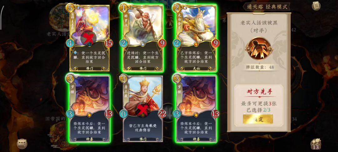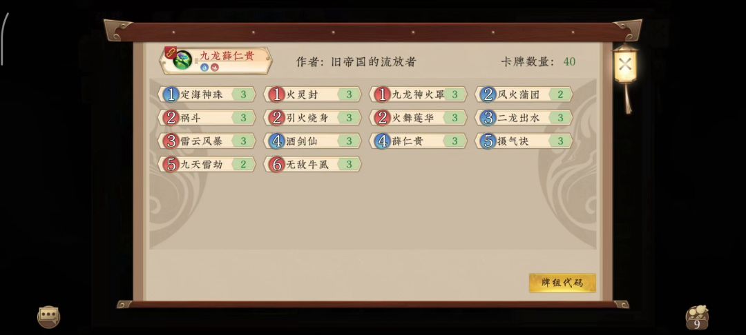 卡组强度:上尊卡组 卡组提供人:雷之力 卡组定位:中速 法术 血线压制 基本思路: 九龙神火罩和祸斗清场,薛仁贵免伤,然后无敌牛输出,雷云斩杀。 生物站位 最左侧空位薛仁贵,最右侧祸斗 注意: 薛仁贵未免伤状态会吃满火舞莲华伤害,若薛仁贵左侧有祸斗薛仁贵会吃祸斗伤害。