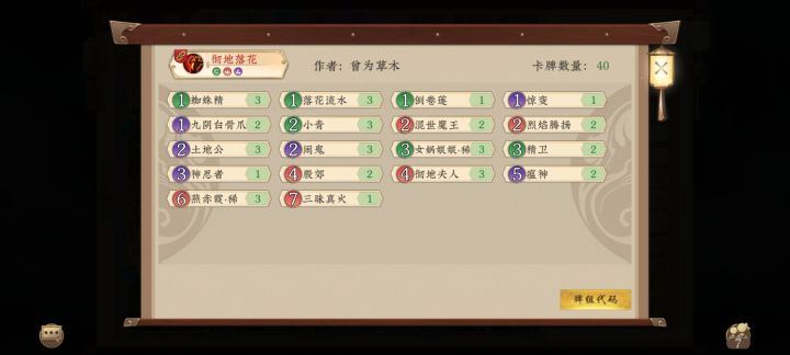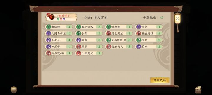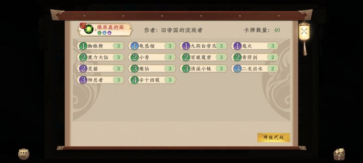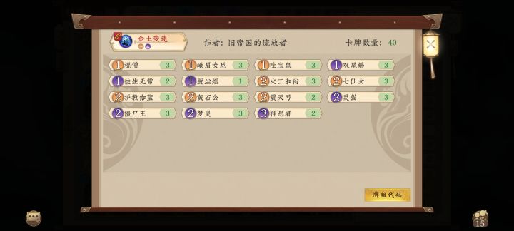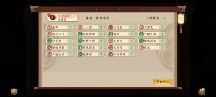 门派金山寺斩杀组件是木系1费的猪油秘技配合土系6费的邪心剑仙和1费的门派技能回血。前期靠木系堆修为,小青,雾里探花,青龙,香妃,枯荣诀。过牌方面就是土系的黑猫,神思者,九阴白骨爪。草头神如果能复制邪剑仙,就可以大大提供伤害,门派技能回13,两个邪剑仙就能对敌人造成26的伤害(前提是你修为上去了)很多卡我没有,所以做不出来,发不了代码。这是个娱乐打法毫无强度可言(毕竟修为很难堆到那么高,堆到那么