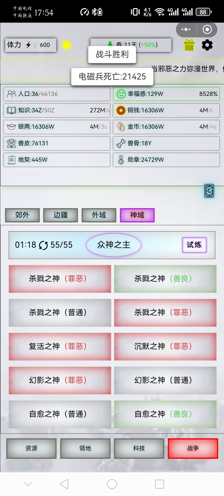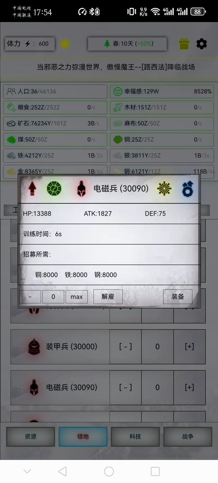 丹药全满,图一为19阶的属性,战损46w。总结:藤甲恶魔对规模要求极大,规模不够建议先打其他的兵种