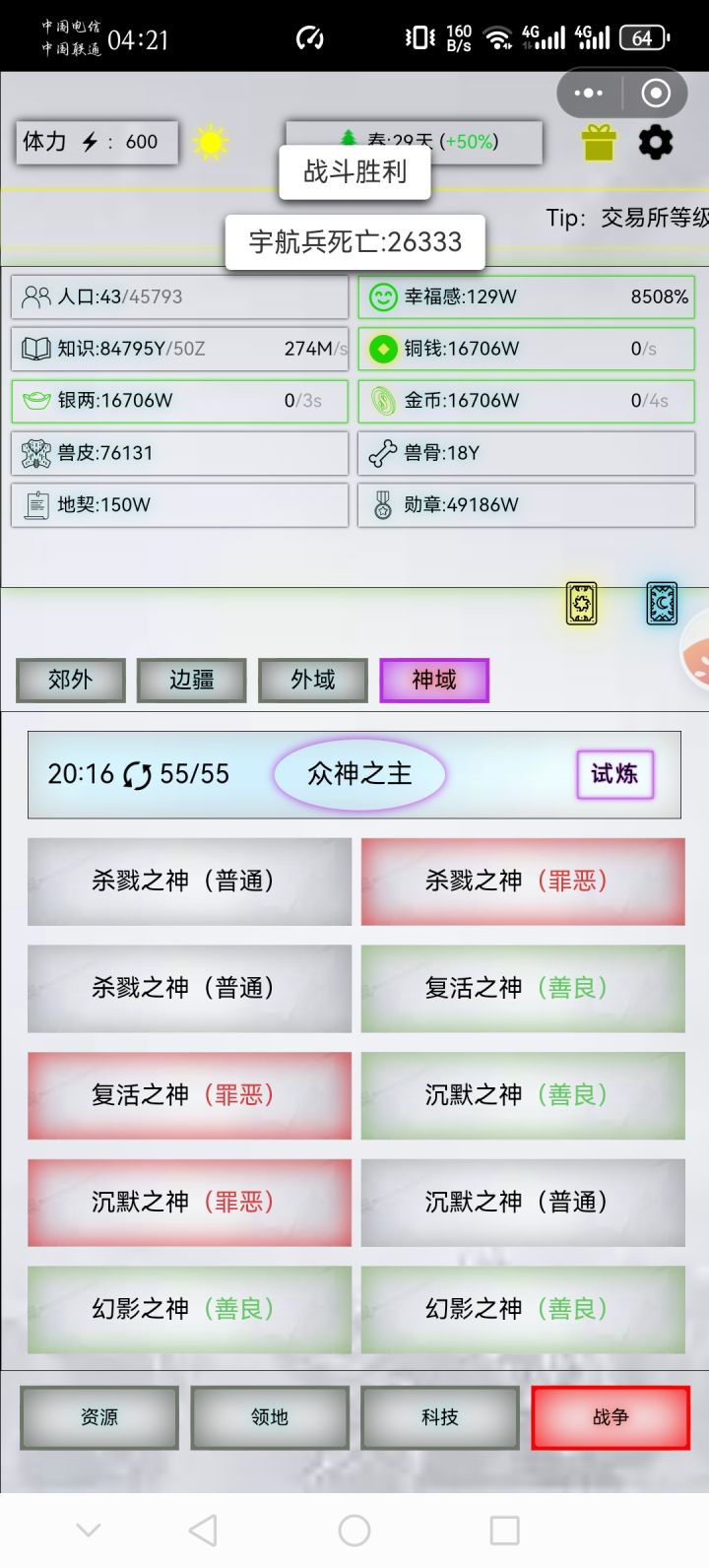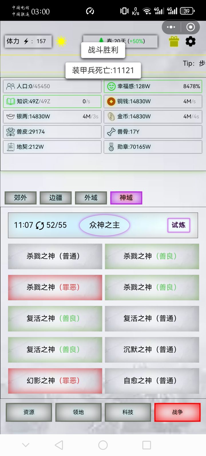 精20,出战30000,战损26333战机原子,丹药500-50-50-50,蒸汽150-700-20扫荡