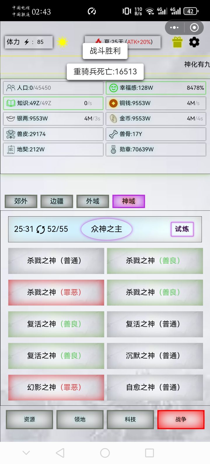 精20,出战20000,战损16513神锋号角,丹药600-60-30-30,蒸汽55-681-15扫荡