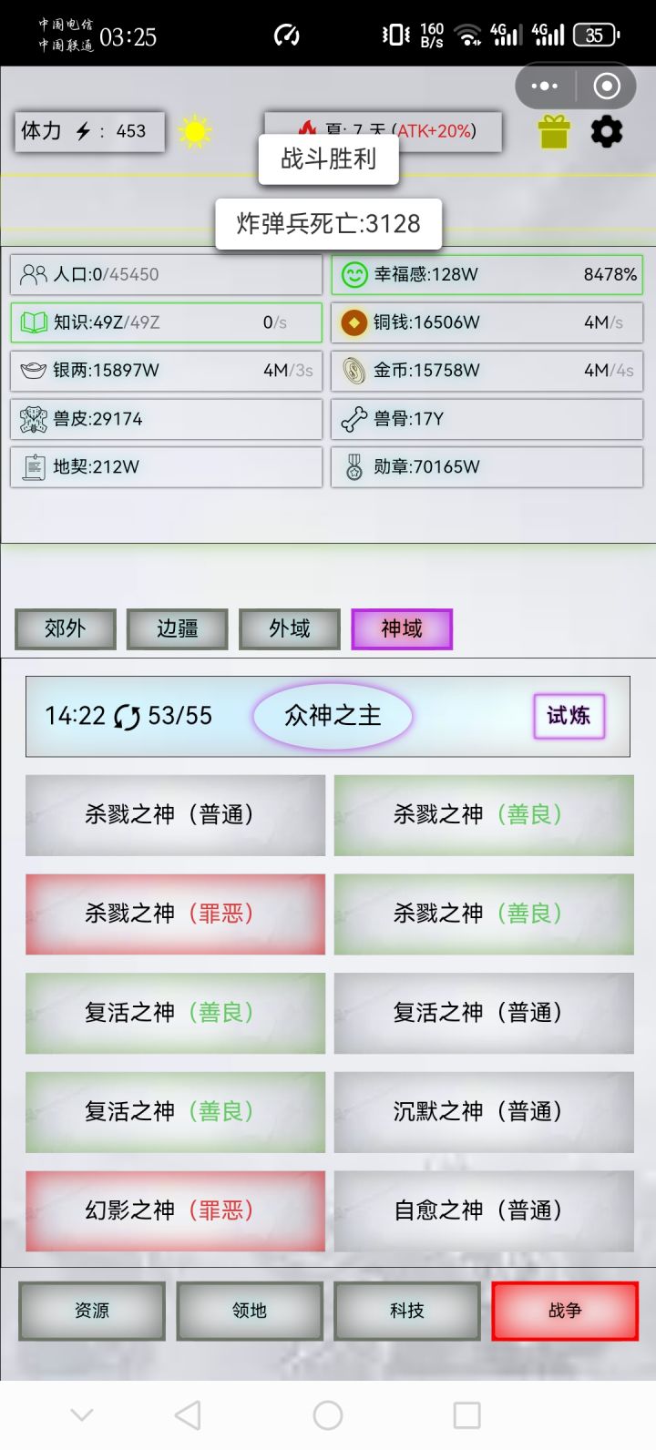 精20,出战3500,战损3128丹药500-50-30-30,蒸汽70-634-15扫荡