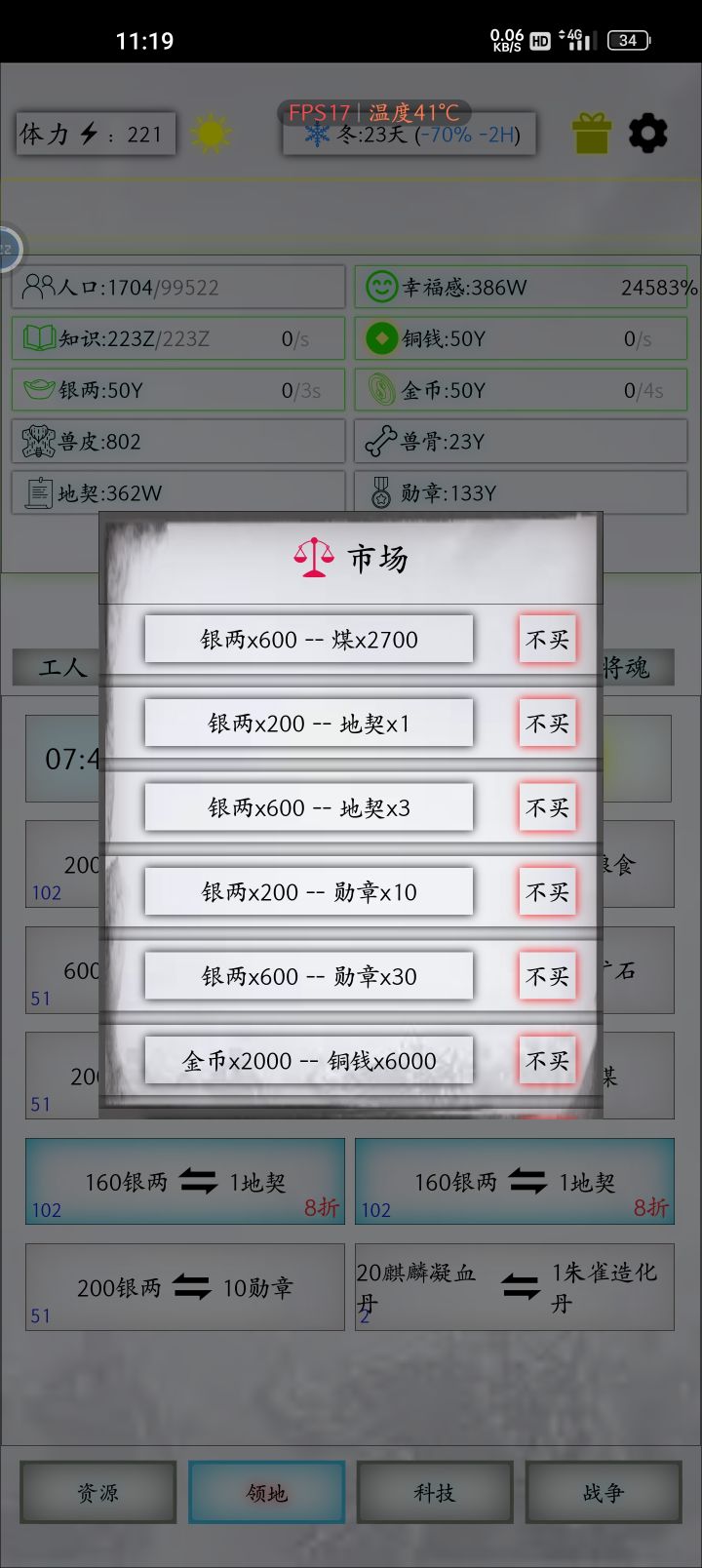 126版本前满刷新次数会自动购买,126版本已修复。目前市场刷新卡顿闪退解决办法是不购买地契勋章。众所周知市场不能连续刷新基本上是刷新一次要等一两秒不然会卡顿以及闪退,众生苦市场久矣市场地契勋章一天24小时72次刷新次数总产量是地契4千~6千,勋章是4万~6万。这点数量玩的久的大概不会有人看的上吧?