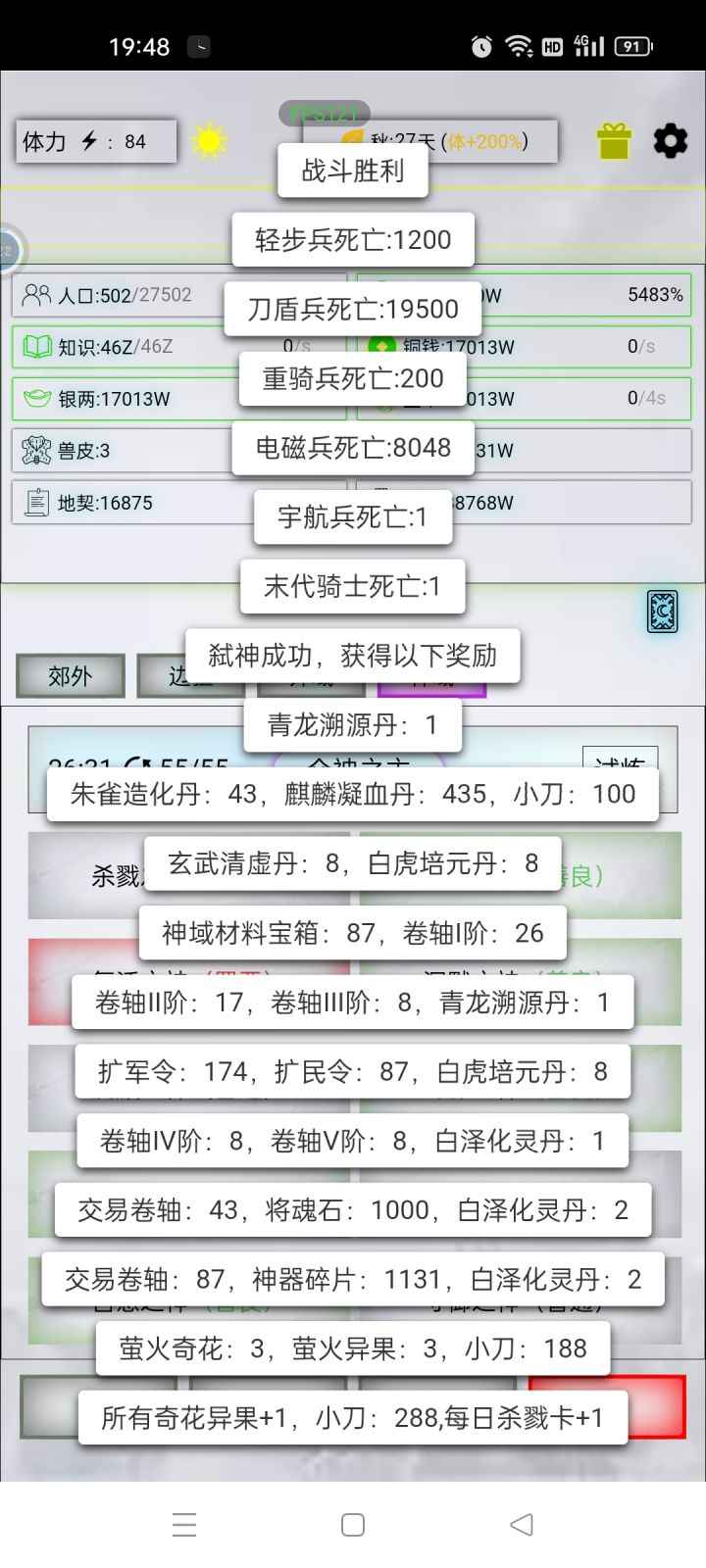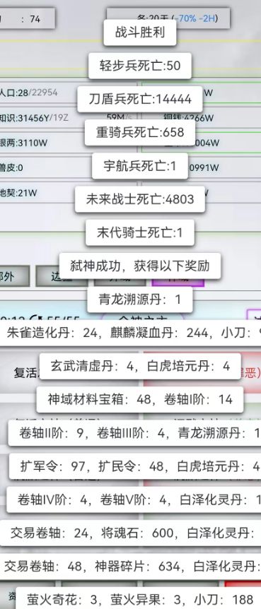 第一个:神的杀戮控制2000+有概率青龙丹第二个:我打神主力是电磁兵,长枪兵是垫刀的(大概是10:2比例减少电磁兵损耗)第三个:复活神是个坑,随机损耗率太大了,另外红守御有概率失败不知道是为什么第四个:我只打普(白)和恶(红)主要是控制杀戮增长率减少净化丹消耗量兵力配置:出战数量控制1999内(减少神体效果)精兵效果我在161末日骑士(神器)加点血和闪避-勋章没地方用300轻步兵(兽杀
