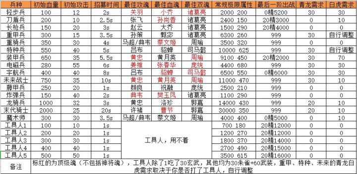 自从玩了这个游戏,杂七杂八的表弄了很多,就不分开了,直接都发在这里,有需要的可以拿去,后续也可能会补充这个最初是想更新一下兵种的初始属性的,老表有几个都不对了,然后又加了将魂推荐和常规极限属性要求,算是个三合一表。这个是量子武装的武装表和极限表,其他大佬已经有几个不同的版本了,不过有的也是老表,注意,这个推荐是按能低级果子就不高级果子的原则来的(15极限不是,15极限最低是20金8红),不想用