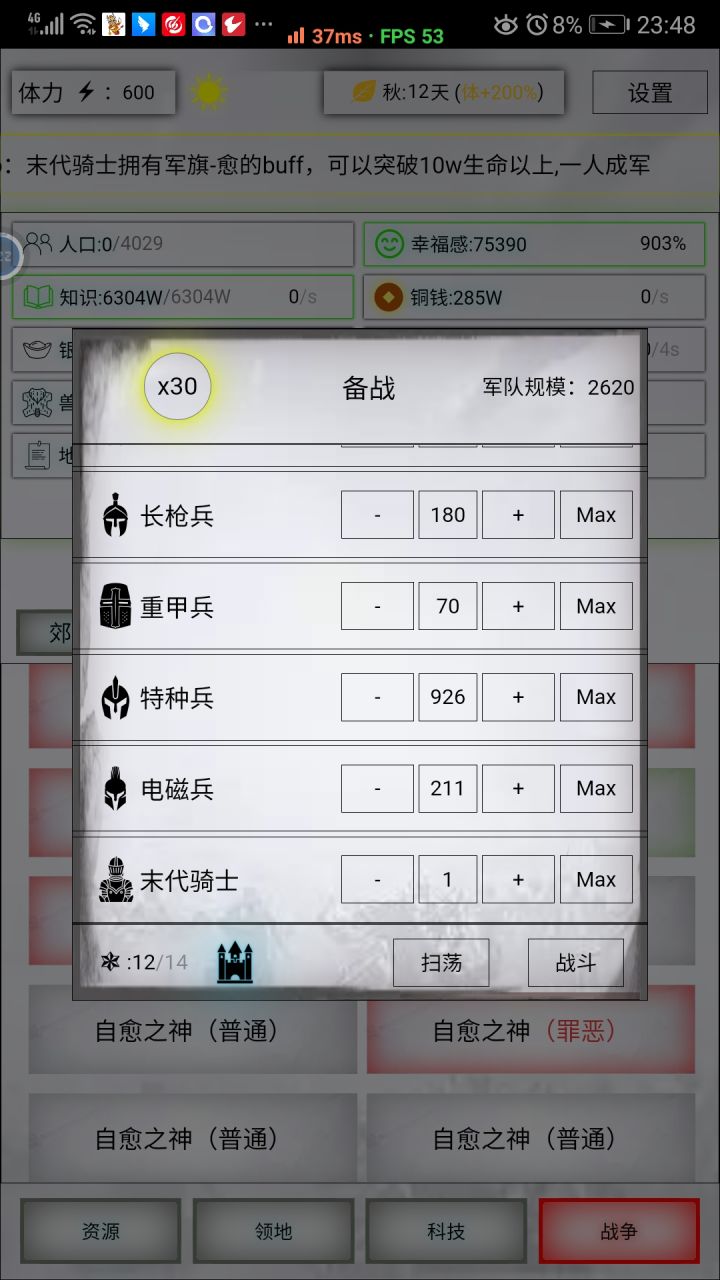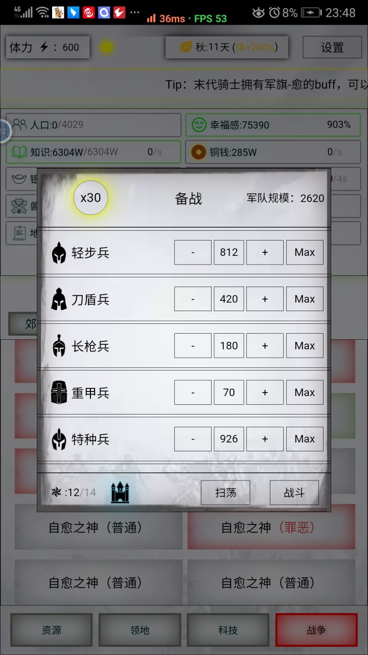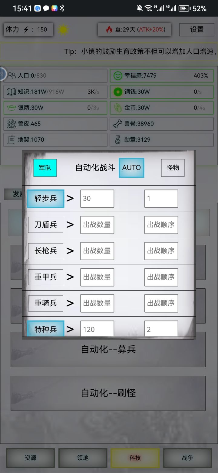 另外还需培养一个主力兵种,当前特种兵比较适合,打外域非常好用。敌人数量多的话,先用炸弹兵减少敌人数量,最后特种兵收尾。外域有些比较难打的怪物可以不用打。像叶皇、芊叶小镇这一类的,因为会见你攻击,打起来相当费时费力,只需扫荡即可。最后就是这游戏比较肝,需要一直刷怪升级刷地契升军队数量。所以可以使用连点器辅助一下,解放双手。不过下版本更新后,就会出现自动化 采集 募兵 打怪等一系列的功能了,非常的拭目以待。