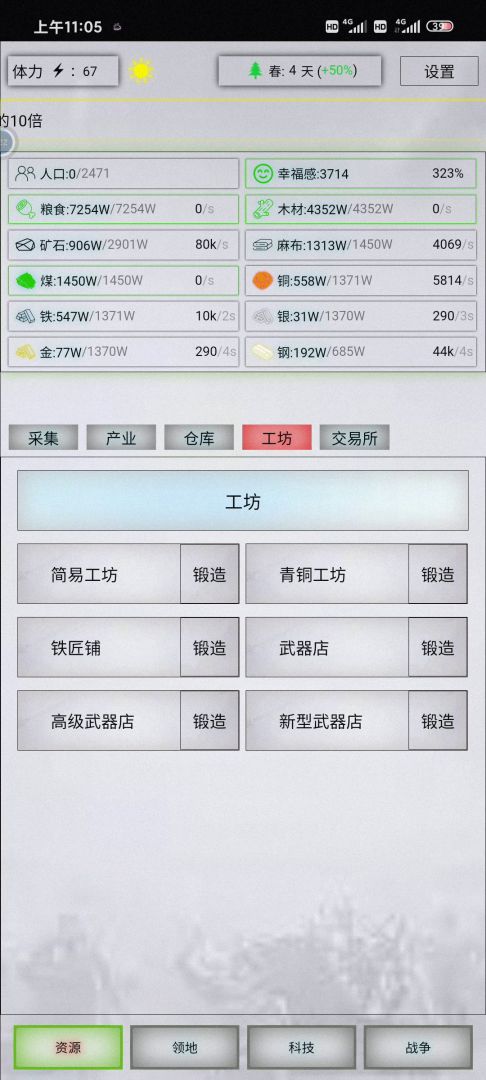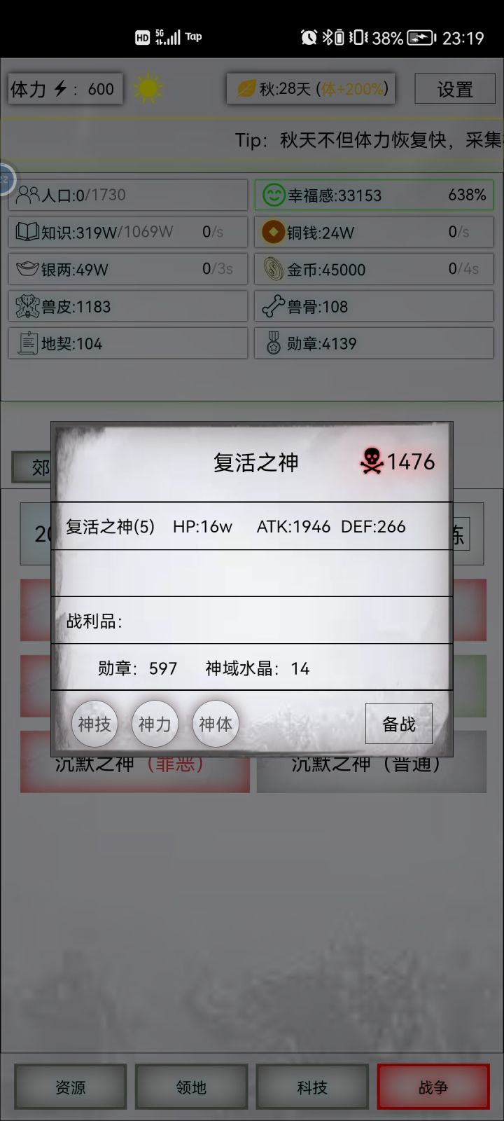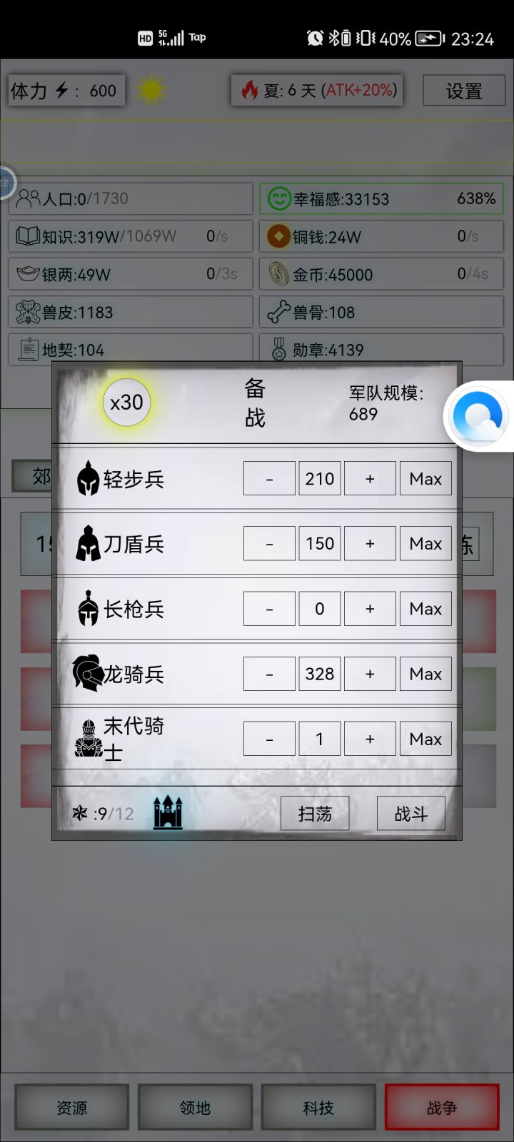 我看了下其他人的字都比较多 开局牧民 挂机升5.6级田 然后 木石学比率112哪个能升级点哪个前期广告一定要看 快速度过4人口阶段 等知识上线500开战争 前期士兵全部轻步兵 武器用兽王剑 丹药直接它 前期哈防具用杀 前期点一级就可以了先能装上中间要卡一段时间的木头升级初始装备前期完美度过 无脑警告⚠️后期升级刷新次数的时候一定要在刷新扫荡前面 不然不起作用后期轻步兵有时候没打过有是
