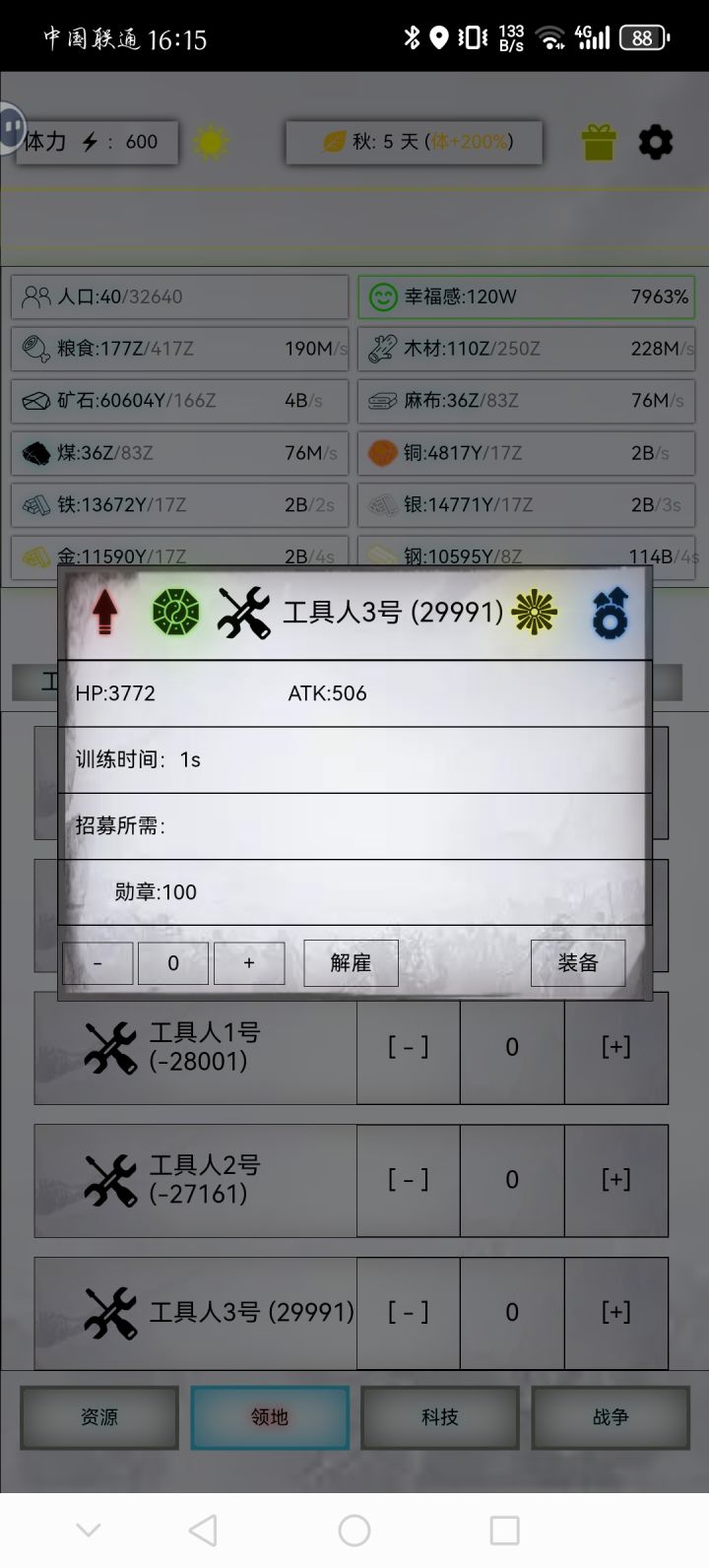 前几天发的最佳演员数有个常数算错了,这次重新发个正确的,你们可以根据公式算然后和自己慢慢调的对比,肯定是一样的。假设最佳演员数为y,当前幸福度为p,总人口为x,当前演员数为y0,则满足 y=(96y0+96x-p-69280)/192。 比如说图中幸福度为48338,总人口为1736,当前演员数为511,则最佳演员数量为 (96*511+96*1736-48338-69280)/192=5